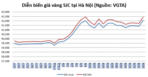 Trong khi đó, tại Hà Nội, giá vàng SJC hiện đang ở mức 42,05 - 42,42 triệu đồng/lượng, tăng 650 nghìn đồng/lượng ở chiều mua vào và tăng 700 nghìn đồng/lượng ở chiều bán ra so với cùng thời điểm hôm qua.