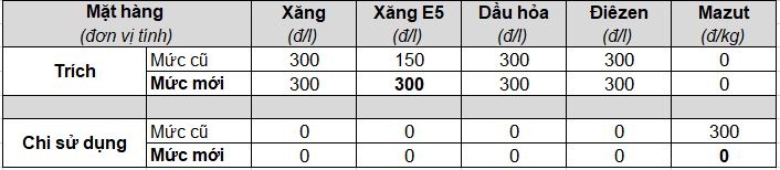 Cơ quan điều hành cũng điều chỉnh mức trích vào Quỹ bình ổn giá với dầu mazut giảm từ 300 đồng về 0 đồng tại kỳ điều hành hôm nay. Xăng E5 RON 92 tăng mức trích từ 150 đồng lên 300 đồng/lít. Các mặt hàng còn lại (dầu diesel, xăng RON 95 và dầu hoả) giữ nguyên trích 300 đồng/lít như cách đây 10 ngày.