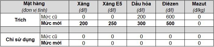 Trong kỳ điều hành lần này, liên Bộ Công Thương - Tài chính không chi từ Quỹ bình ổn với các mặt hàng xăng, dầu. Thay vào đó, mức trích từ Quỹ bình ổn với xăng RON 95-III tăng từ 0 đồng lên 200 đồng/lít; E5 RON 92 tăng lên 250 đồng/lít so với kỳ điều hành trước. Mức trích quỹ với dầu diesel giảm 100 đồng xuống 500 đồng/lít. Dầu hoả có mức trích lập vào quỹ là 300 đồng/lít, tăng 100 đồng. Riêng mức trích lập với dầu mazut vẫn duy trì 0 đồng/kg như kỳ điều hành trước.