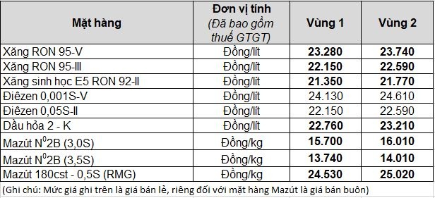 Tương tự, các mặt hàng dầu (trừ dầu diesel) đều tăng giá. Cụ thể, mỗi lít dầu hỏa tăng 600 đồng lên 22.760 đồng/lít; dầu mazut tăng 110 đồng lên 13.740 đồng/kg; Riêng dầu diesel giữ nguyên giá bán 22.150 đồng/lít.