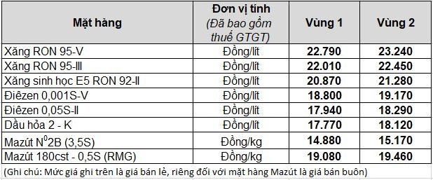 Bình quân giá thành phẩm xăng dầu thế giới giữa kỳ điều hành giá ngày 22/5/2023 và kỳ điều hành ngày 1/6/2023 là: 87,438 USD/thùng xăng RON92 dùng để pha chế xăng E5RON92 (tăng 2,292 USD/thùng, tương đương tăng 2,69% so với kỳ trước); 92,433 USD/thùng xăng RON95 (tăng 2,800 USD/thùng, tương đương tăng 3,12% so với kỳ trước); 87,903 USD/thùng dầu hỏa (giảm 1,285 USD/thùng, tương đương giảm 1,44% so với kỳ trước); 89,059 USD/thùng dầu điêzen (giảm 0,126 USD/thùng, tương đương giảm 0,14% so với kỳ trước); 424,785 USD/tấn dầu mazut 180CST 3,5S (giảm 10,792 USD/tấn, tương đương giảm 2,48% so với kỳ trước).