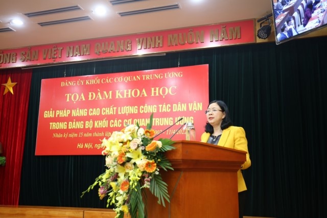 Phát biểu tại Tọa đàm, đồng chí Bùi Thị Minh Hoài, Bí thư Trung ương Đảng, Trưởng Ban Dân vận Trung ương ghi nhận và đánh giá cao nỗ lực, cố gắng, những kết quả, thành tích của Đảng bộ Khối và các đảng bộ trực thuộc trong thời gian vừa qua. Đồng chí Trưởng Ban Dân vận Trung ương nhấn mạnh, mặc dù đặc thù Đảng ủy Khối không có chính quyền cùng cấp; công tác dân vận không gắn với địa bàn dân cư; song, Ban Chấp hành, Ban Thường vụ Đảng ủy Khối các cơ quan Trung ương đã chủ động, kịp thời ban hành các nghị quyết, kết luận, chương trình, kế hoạch công tác phù hợp để lãnh đạo, chỉ đạo và tổ chức thực hiện tốt công tác dân vận ở Đảng bộ Khối các cơ quan Trung ương, nhất là đẩy mạnh công tác dân vận của đảng bộ cơ quan nhà nước. Điều này không chỉ tác động tích cực đến kết quả công tác ở các cơ quan Trung ương mà còn có ảnh hưởng quan trọng vào hiệu quả công tác dân vận trên cả nước, góp phần vào việc ổn định xã hội, củng cố niềm tin của nhân dân vào chủ trương, đường lối của Đảng, chính sách, pháp luật của Nhà nước.