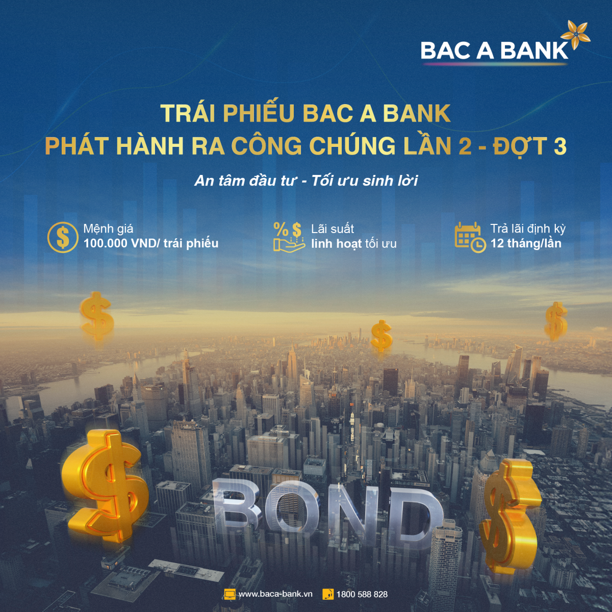 Tiếp nối thành công, sức hút của các đợt phát hành trái phiếu trước đó, đồng thời gia tăng cơ hội đầu tư hiệu quả cho khách hàng, từ ngày 04/08/2025, ngân hàng TMCP Bắc Á (BAC A BANK) chính thức chào bán 15.000.000 trái phiếu phát hành ra công chúng Lần 2 - Đợt 3, với tổng giá trị chào bán 1.500 tỷ đồng. Hai ký hiệu trái phiếu BAB203-07L và BAB203-07C đều có kỳ hạn 7 năm, được trả lãi định kỳ 12 tháng/lần, thời gian thực hiện quyền mua lại lần lượt là 18 tháng và 24 tháng kể từ ngày phát hành.