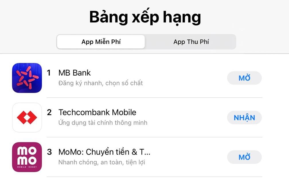 Thực tế, từ tháng 6/2020, App MBBank đã vượt qua rất nhiều App nổi tiếng của quốc tế, vươn lên đứng đầu về lượt tải trên App store tại Việt Nam (đối với các ứng dụng miễn phí). Ngay cả các ứng dụng đang là ‘hot trend’ tại thời điểm đó như FaceApp cũng tụt xuống vị trí thứ 2, xếp sau đó là các app nổi tiếng quốc tế như Facebook, YouTube, Instagram, Tiktok,…