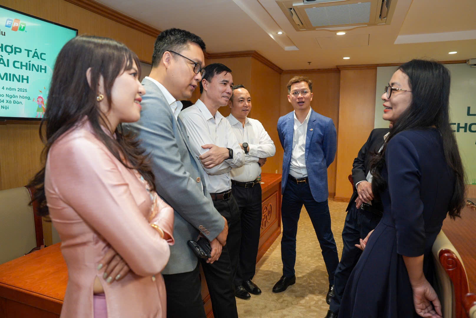 | Đại diện Thời báo Ngân hàng và đại diện Tập đoàn FPT trao biên bản hợp tác |