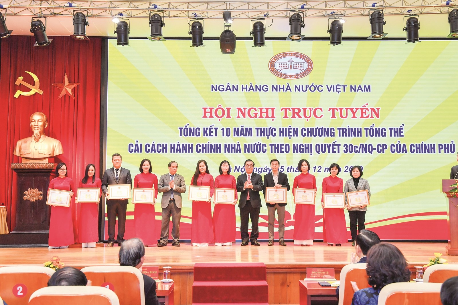 | Tại Hội nghị, 12 tập thể và 10 cá nhân đã được Thống đốc NHNN tặng Bằng khen về thành tích xuất sắc trong thực hiện công tác CCHC |
