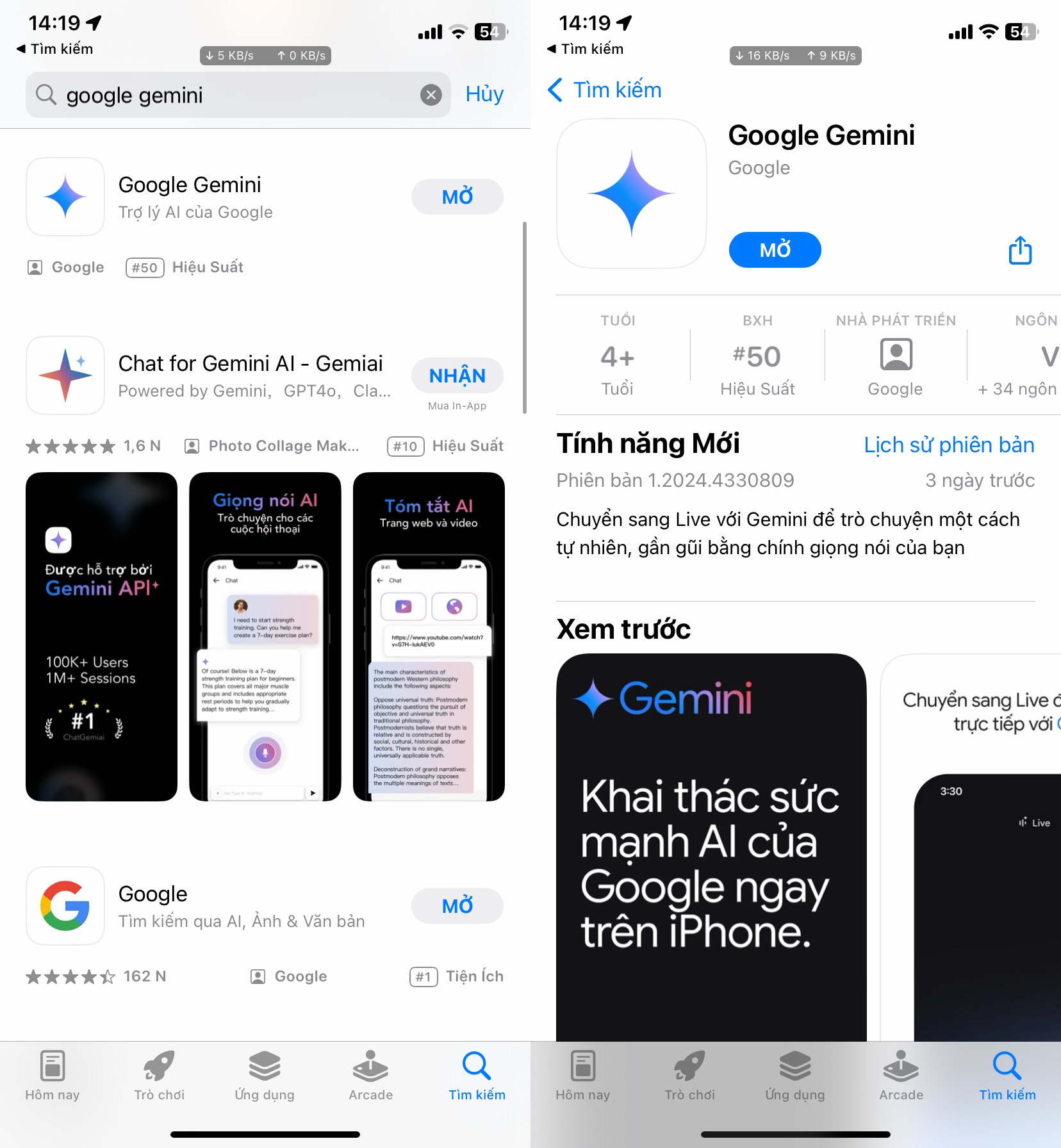 Thế nhưng, từ ngày 12/11, người dùng iPhone tại Việt Nam có thể tải xuống và trải nghiệm ứng dụng Gemini độc lập. Theo thông tin từ phía Google, ứng dụng này sẽ có dung lượng khoảng 84,5 MB và yêu cầu iOS 16.0 trở lên. Để tìm kiếm, người dùng chỉ cần nhập từ khóa “Google Gemini” ngay trong phần nhập liệu của App Store hoặc truy cập tại đây.