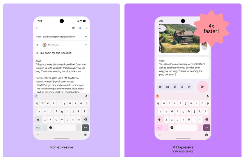 Kết quả cho thấy người dùng có thể nhận diện các yếu tố chính trên giao diện nhanh hơn gấp 4 lần khi sử dụng M3 Expressive. Một ví dụ trực quan được đưa ra là so sánh giao diện Gmail hiện tại với bản concept theo M3 Expressive, cho thấy sự cải thiện rõ rệt về khả năng sử dụng và mức độ dễ hiểu.