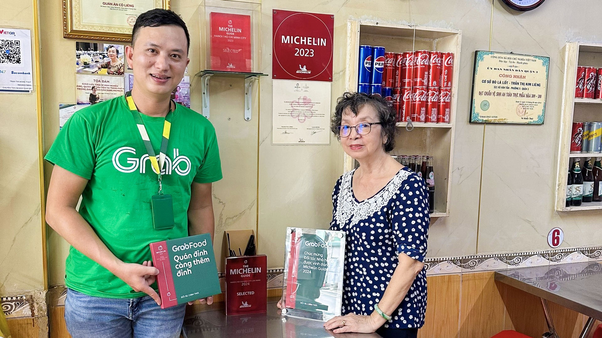 | Đại diện Grab chúc mừng đối tác Trần Thị Kim Liêng - chủ quán Cô Liêng được MICHELIN Guide đề xuất |