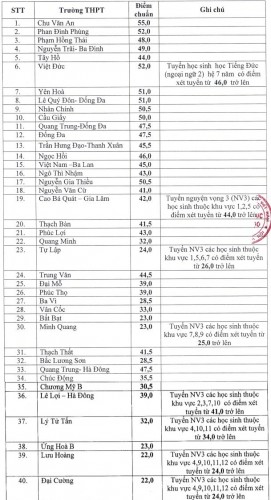 Một số trường thuộc top đầu như Chu Văn An, Phan Đình Phùng, Việt Đức, Lê Quý Đôn... đã giảm 0,5 điểm. Cụ thể, Chu Văn An - 55 điểm, Phan Đình Phùng - 52 điểm, Việt Đức - 52 điểm, Lê Quý Đôn - 51 điểm.