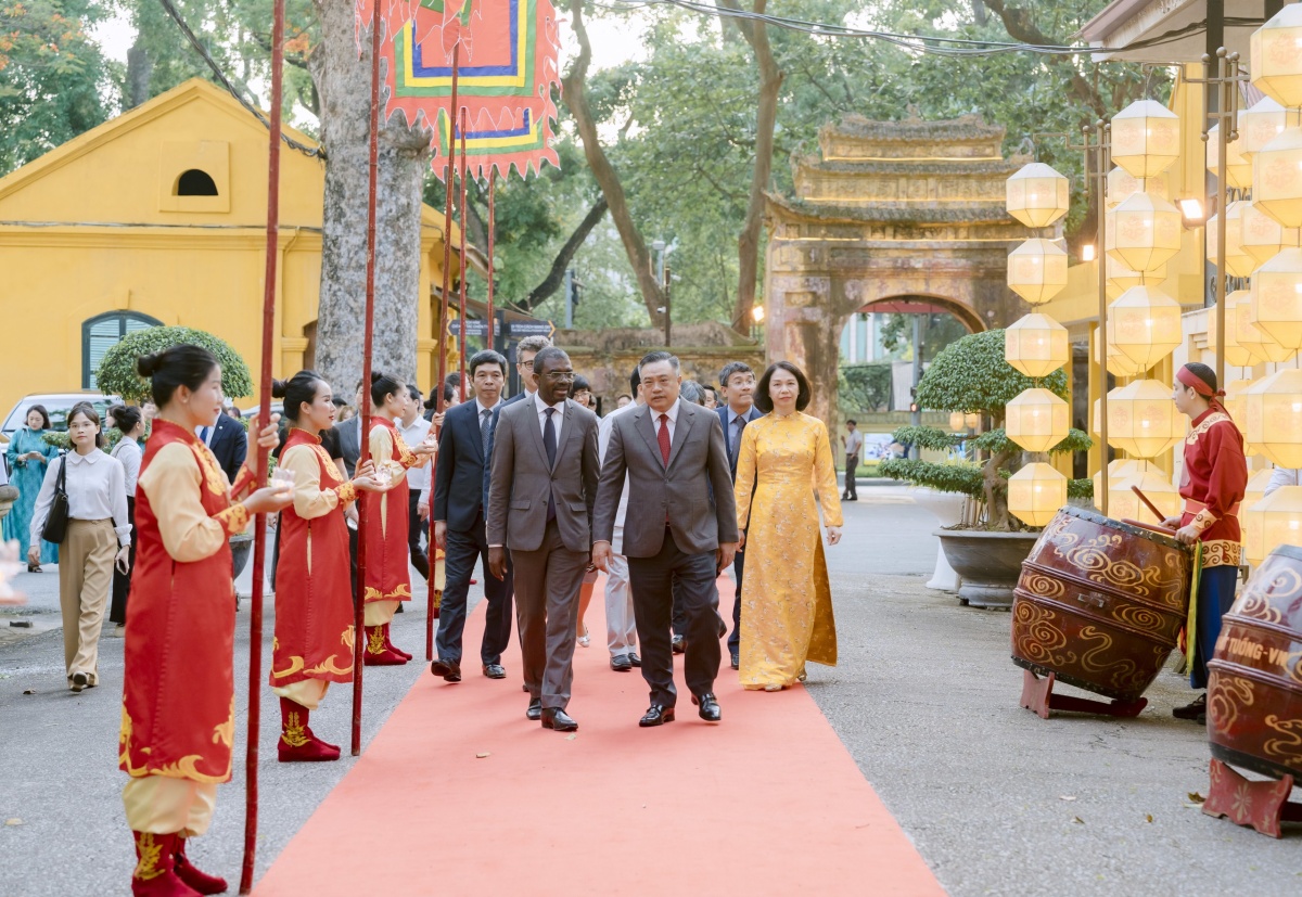 | Chủ tịch UBND thành phố Hà Nội Trần Sỹ Thanh cùng Giám đốc Trung tâm Di sản thế giới Lazare Eloundou Assomo và các đại biểu tham quan khu di tích Hoàng thành Thăng Long |