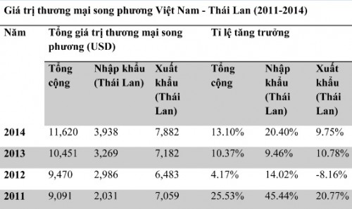 Thống kê từ Bộ Thương mại Thái Lan cho thấy, trong năm 2014, giao thương giữa Thái Lan và Việt Nam đạt 11.62 tỷ USD, tăng so với con số 10,4 tỷ USD của năm 2013. Gần đây, Việt Nam là thị trường nhập khẩu lớn thứ 11 của Thái Lan, trong đó hàng hóa Thái Lan chiếm 20.40% trong tổng thị trường hàng nhập khẩu tại Việt Nam.