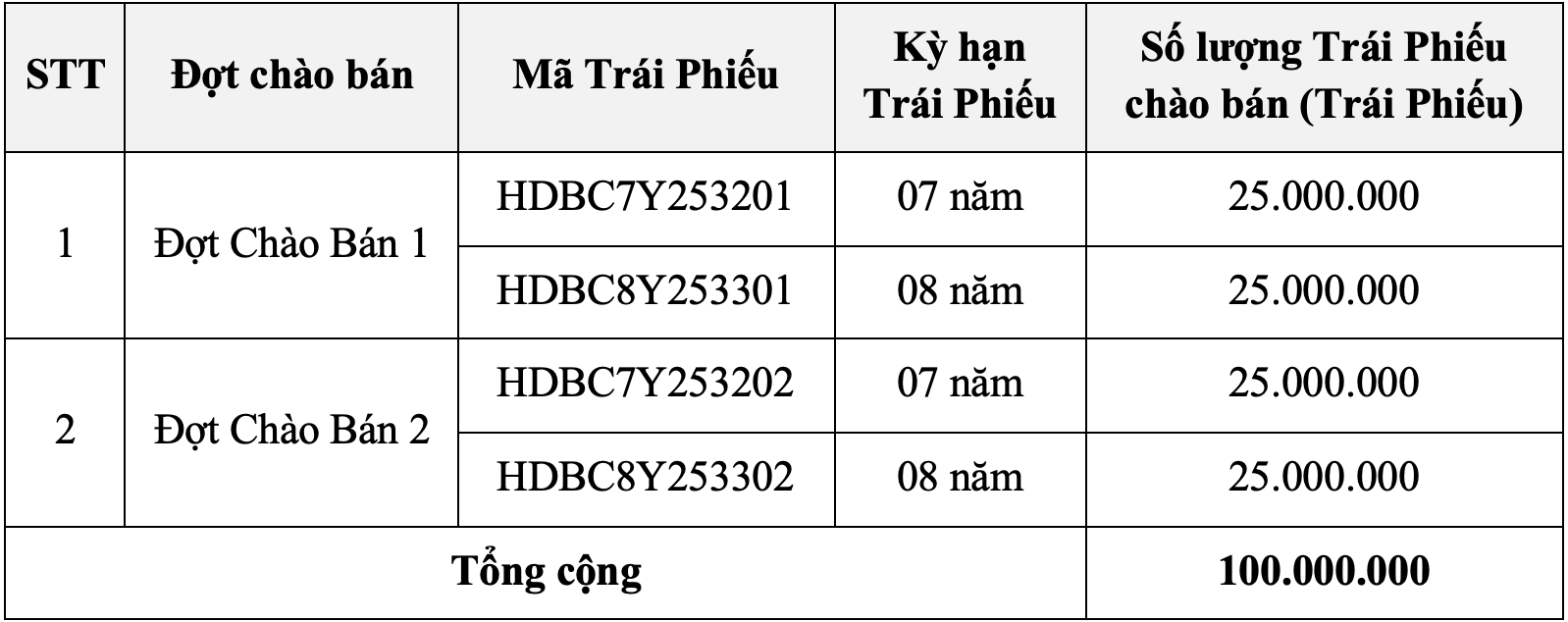 - Tổng số lượng trái phiếu chào bán: 100.000.000 (Một trăm triệu) Trái Phiếu, được chia làm 02 (Hai) Đợt chào bán như sau: