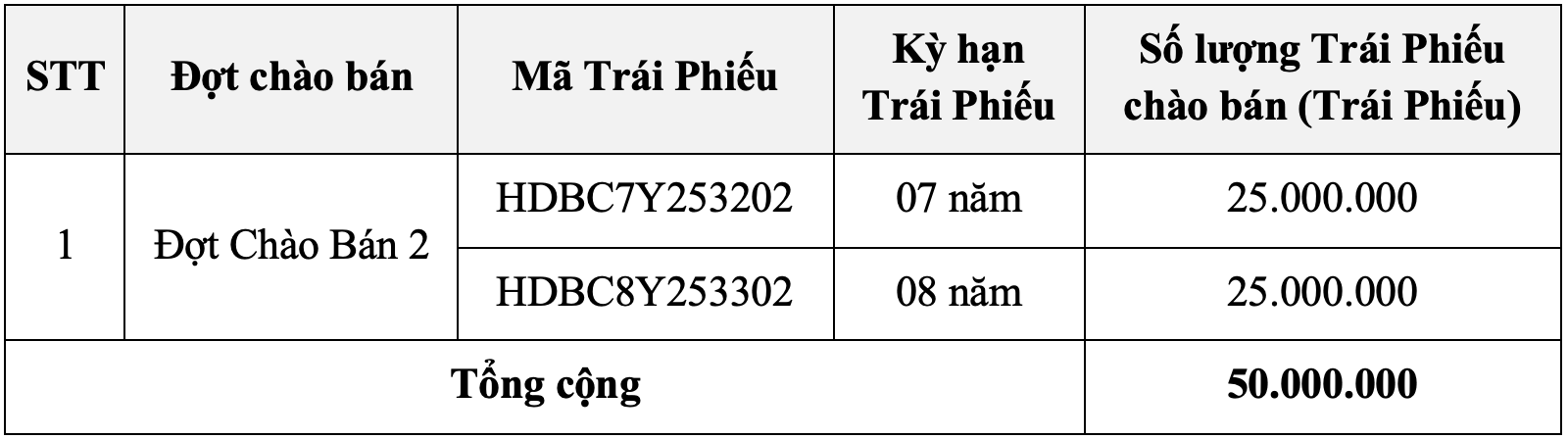 Trái Phiếu có kỳ hạn 07 năm có mã trái phiếu là HDBC7Y253202.