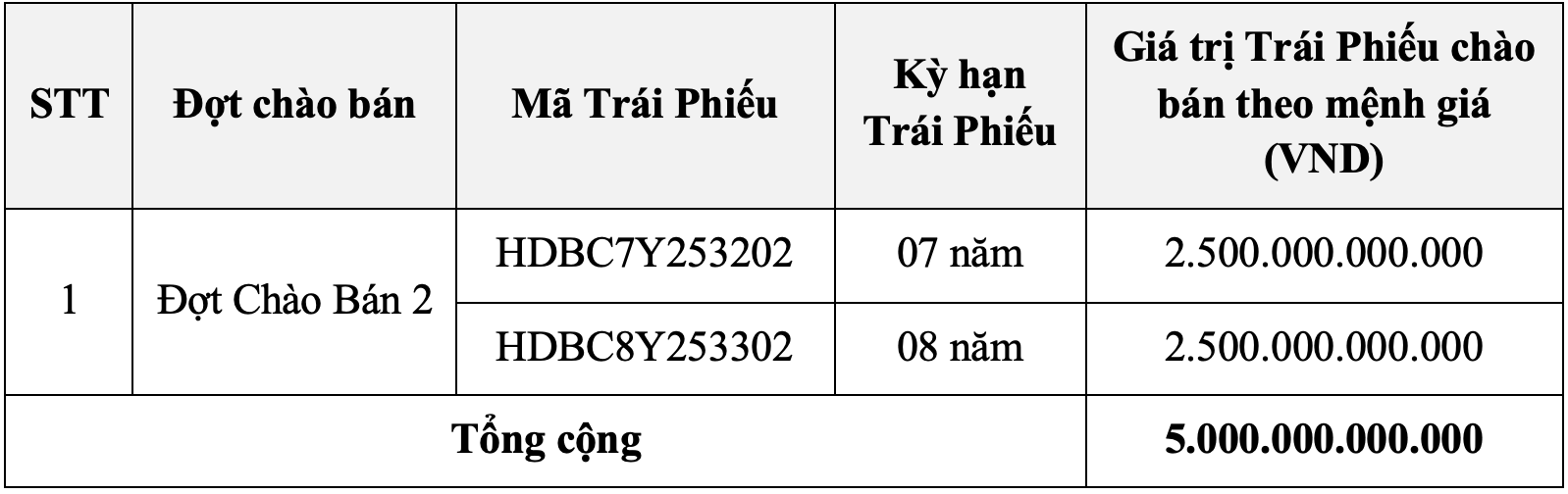 - Tổng giá trị trái phiếu chào bán (theo mệnh giá): 5.000.000.000.000 VND (Năm nghìn tỷ đồng) gồm 2 mã trái phiếunhư sau: