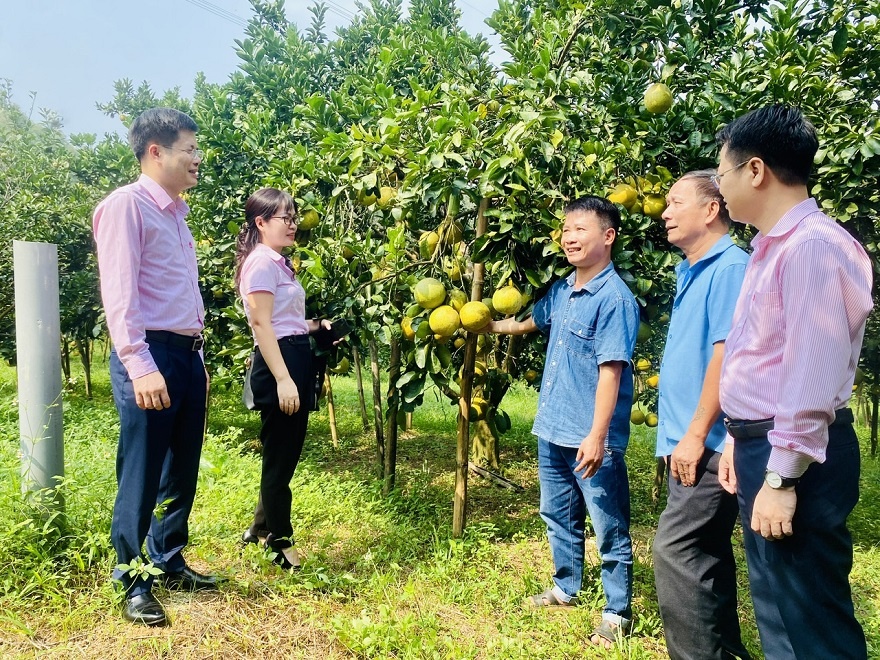 | Ông Ngô Ngọc Hải chia sẻ về mô hình trồng bưởi của gia đình với cán bộ NHCSXH |
