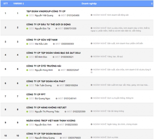 Hòa Phát trong Top 10 DN lớn nhất 2018 (Nguồn: www.vnr500.com.vn)