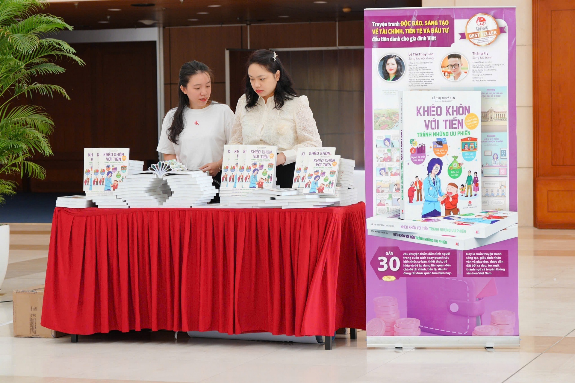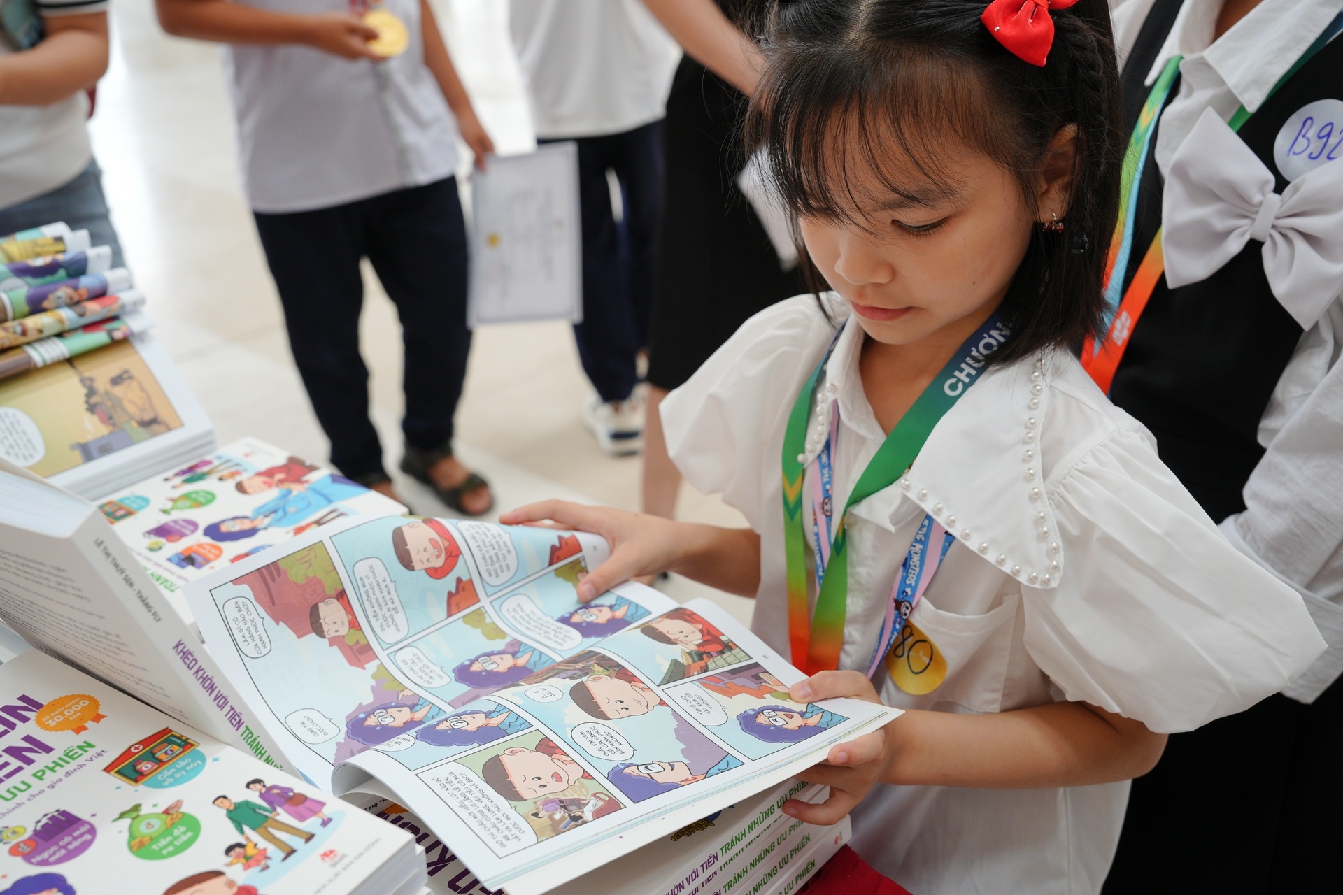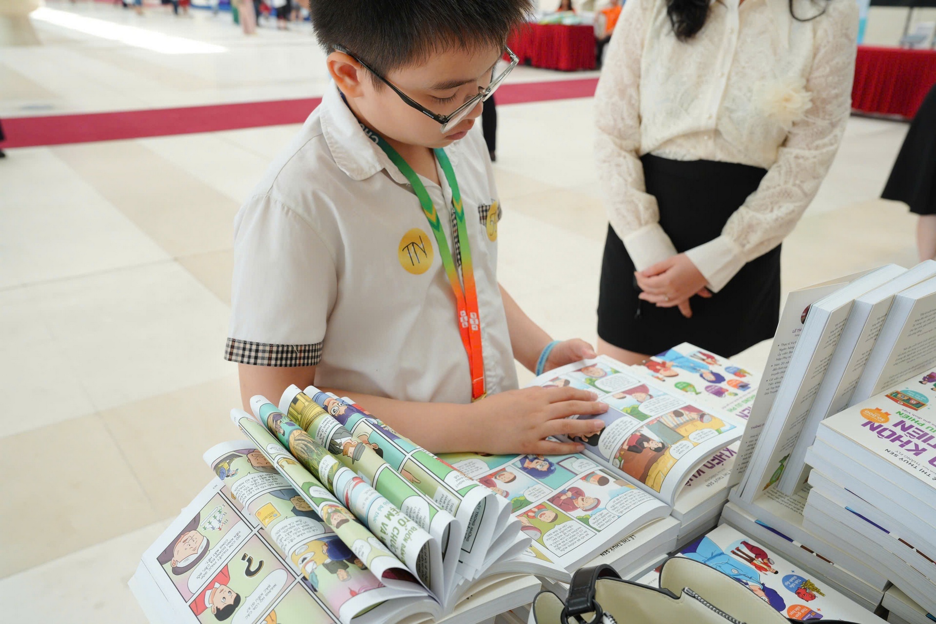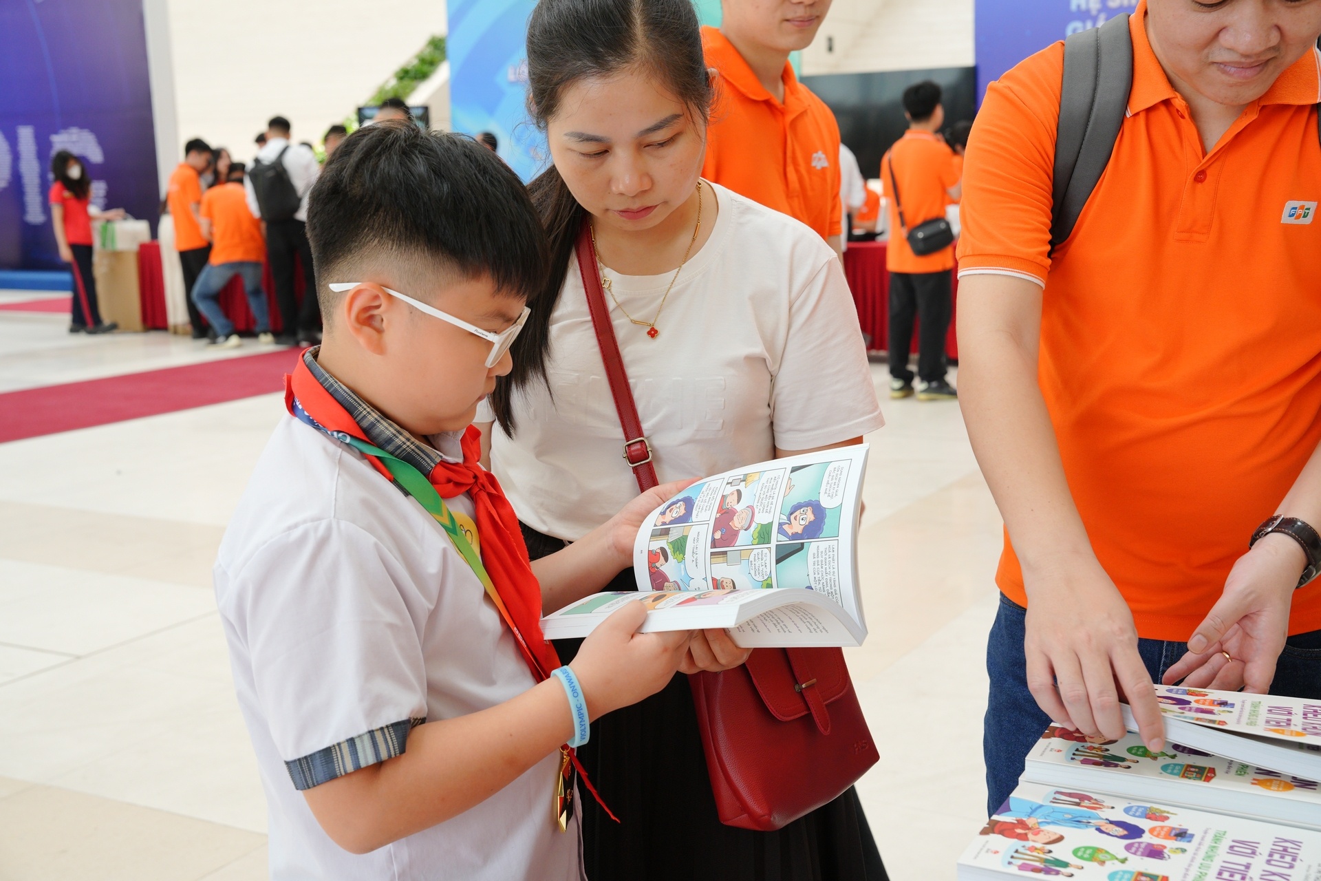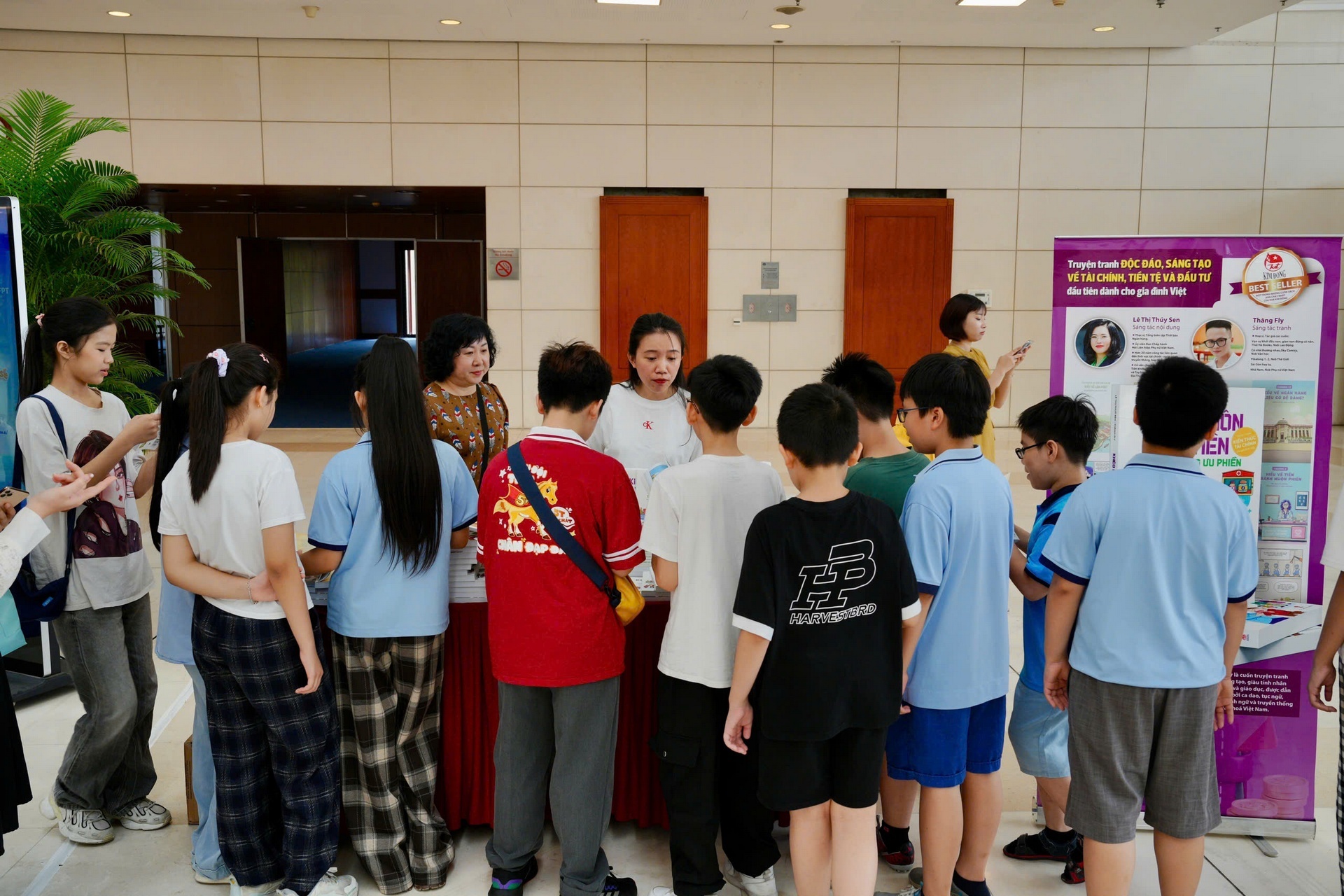 Tại khu vực trưng bày, nhiều em nhỏ thích thú đọc truyện tranh, tham gia các trò chơi tương tác vui nhộn, trong khi phụ huynh cũng dành thời gian tìm hiểu về nội dung giáo dục tài chính dành cho con trẻ.