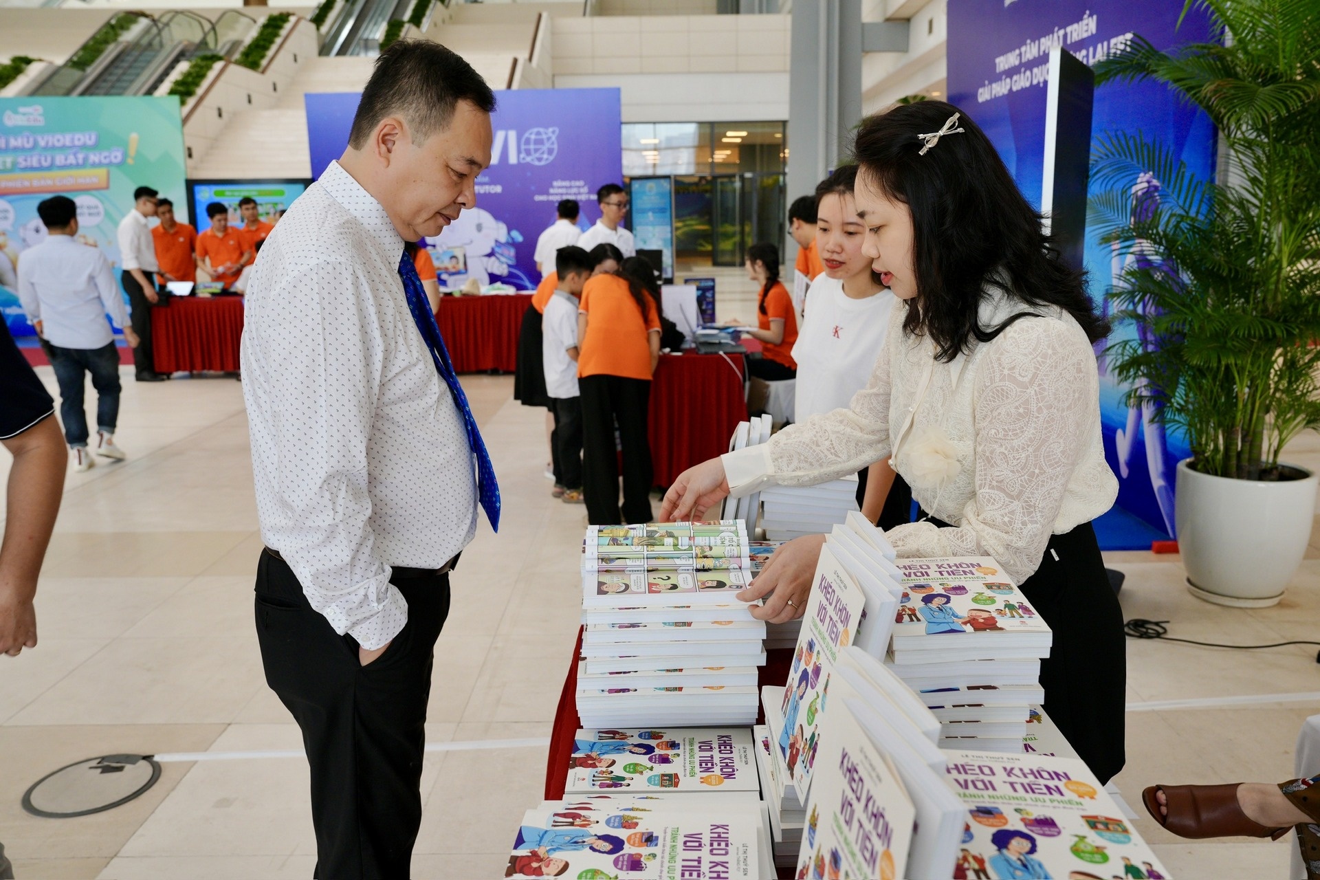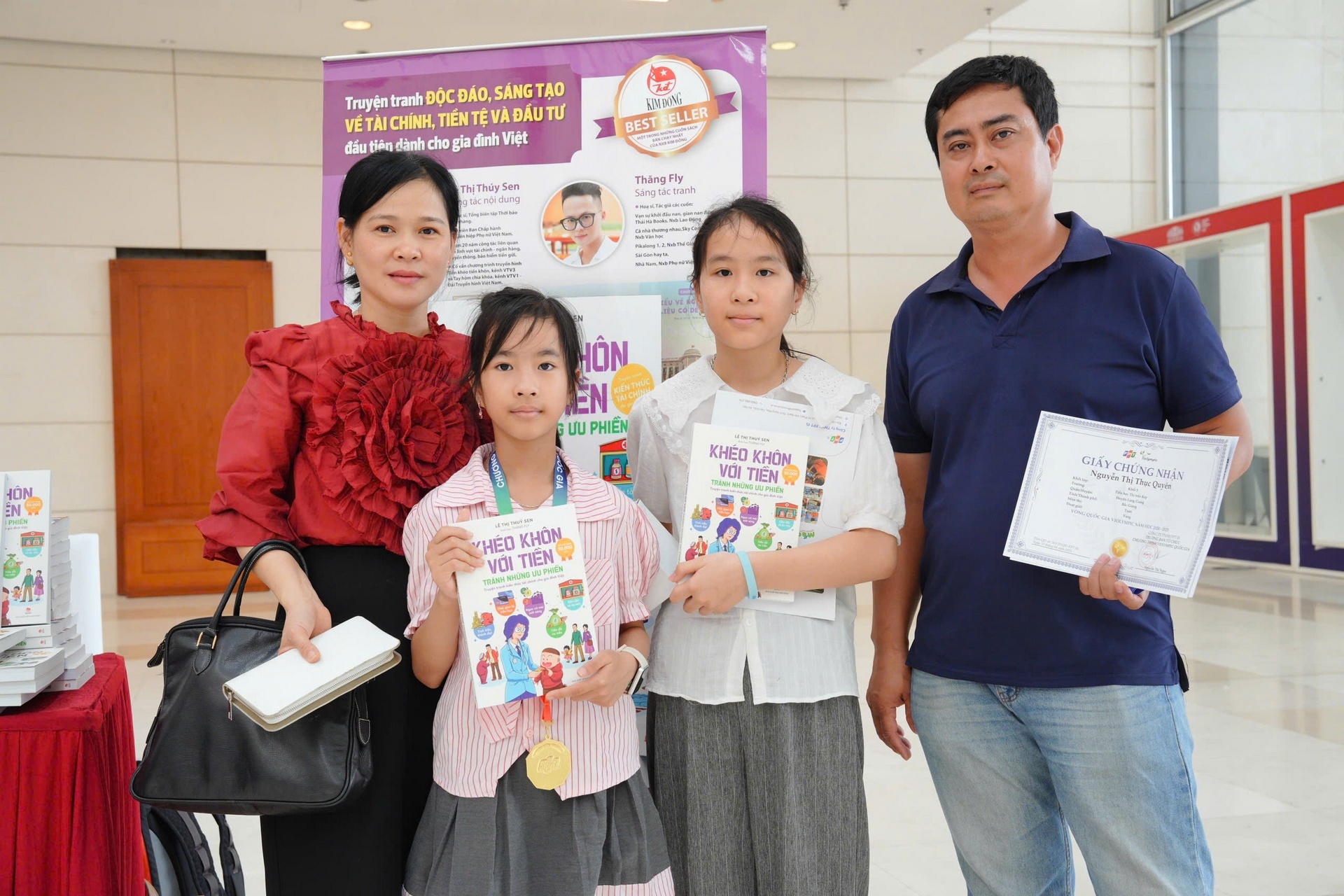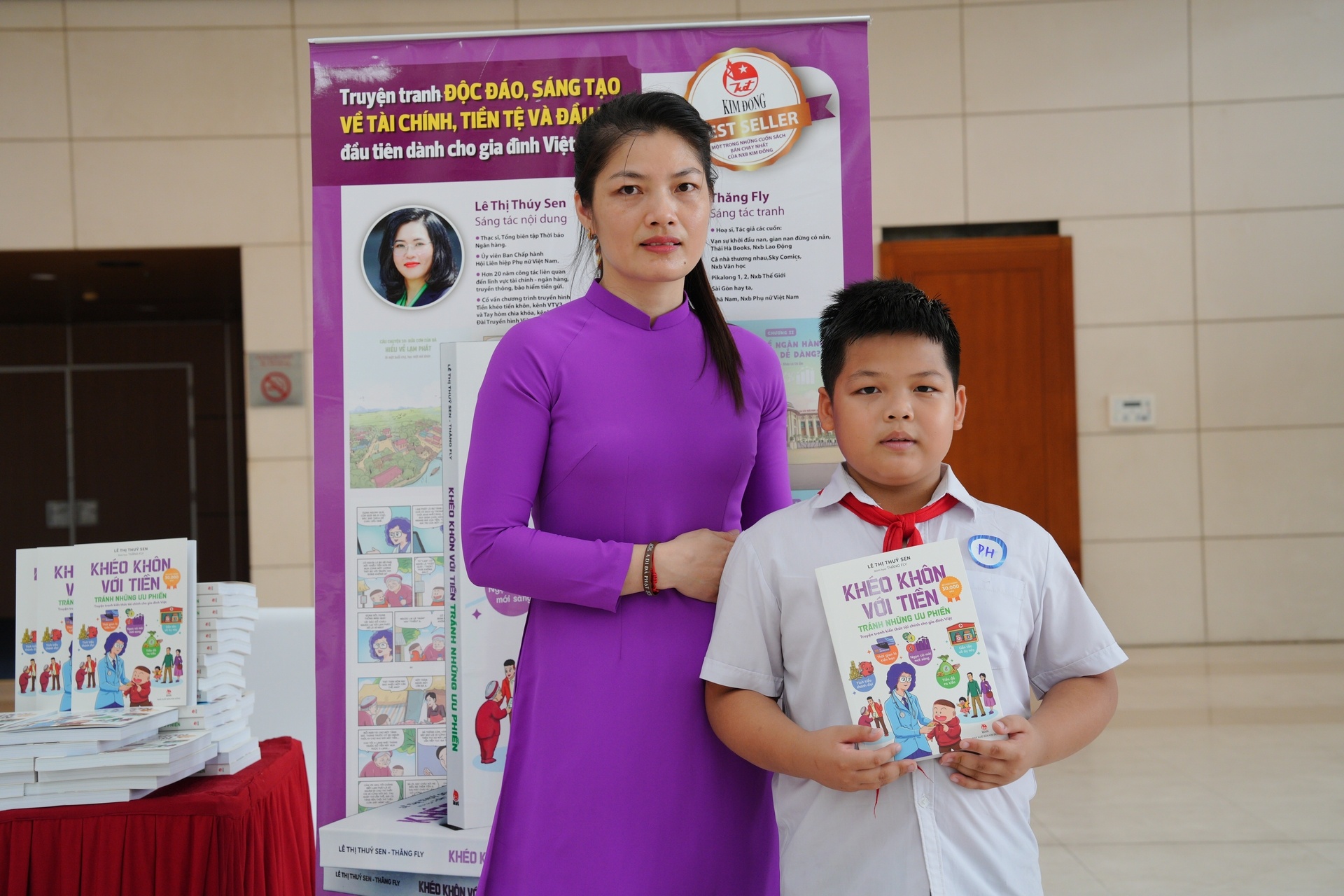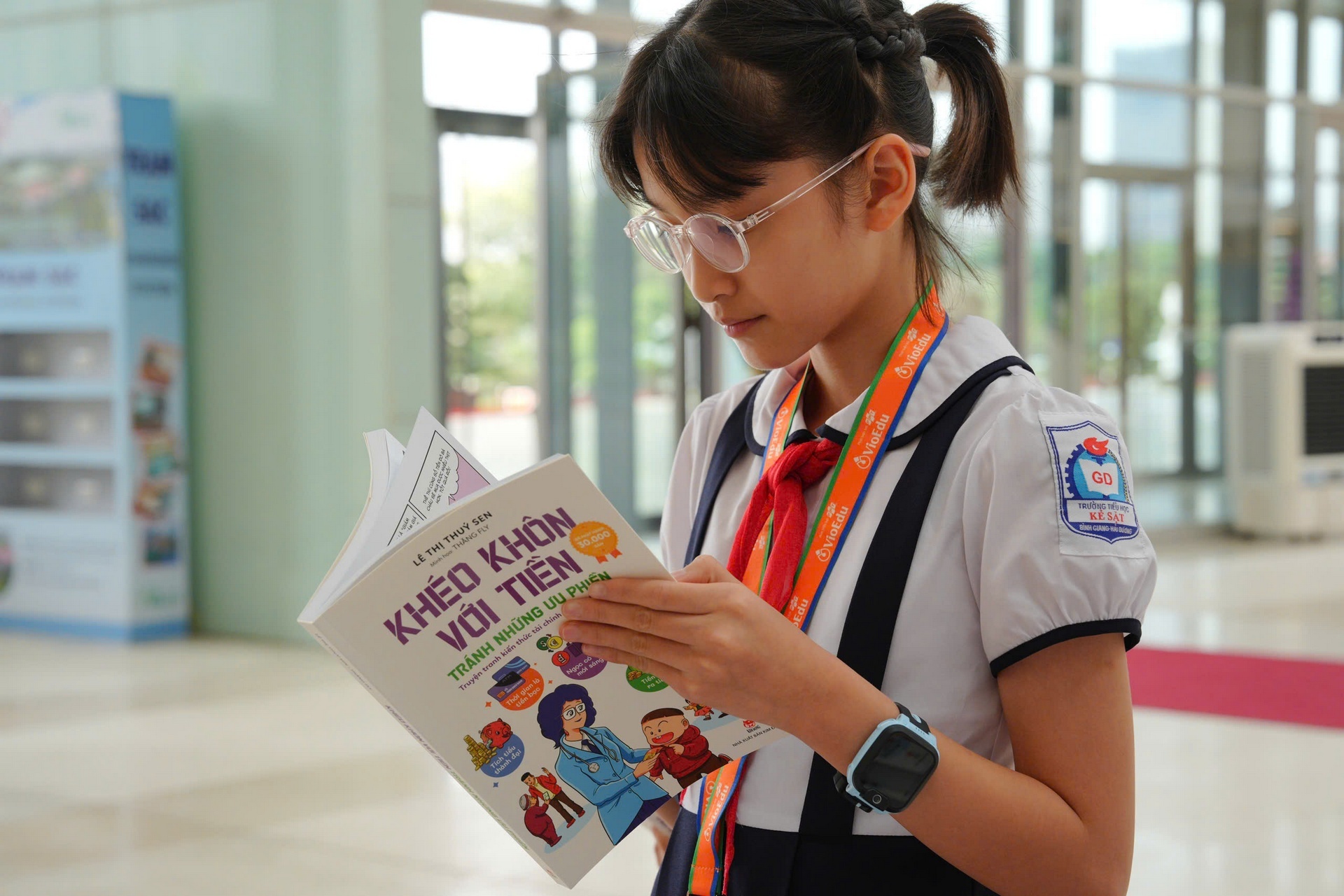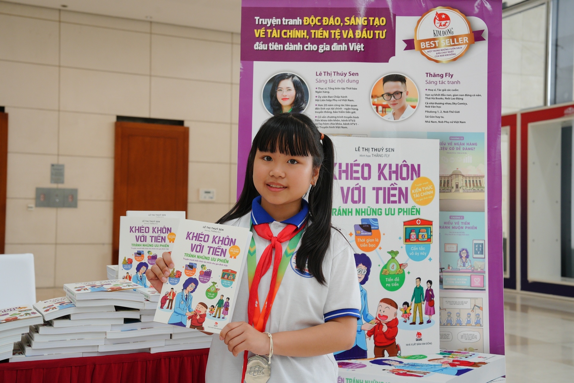 Tại khu vực trưng bày, nhiều em nhỏ thích thú đọc truyện tranh, tham gia các trò chơi tương tác vui nhộn, trong khi phụ huynh cũng dành thời gian tìm hiểu về nội dung giáo dục tài chính dành cho con trẻ.