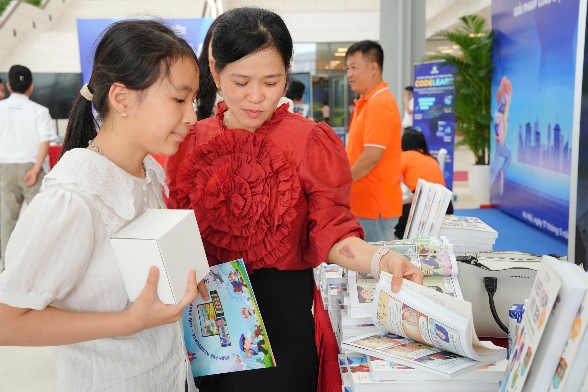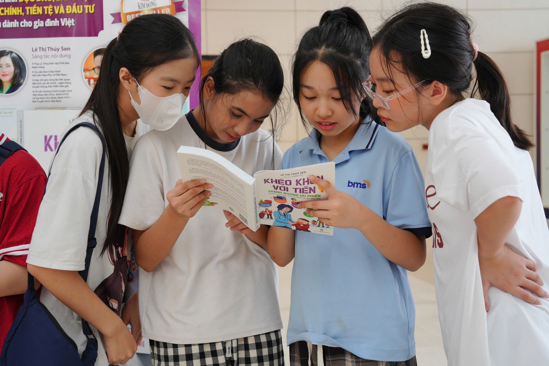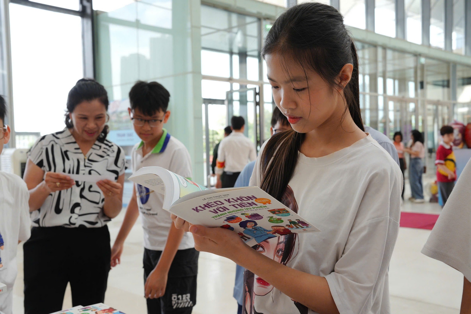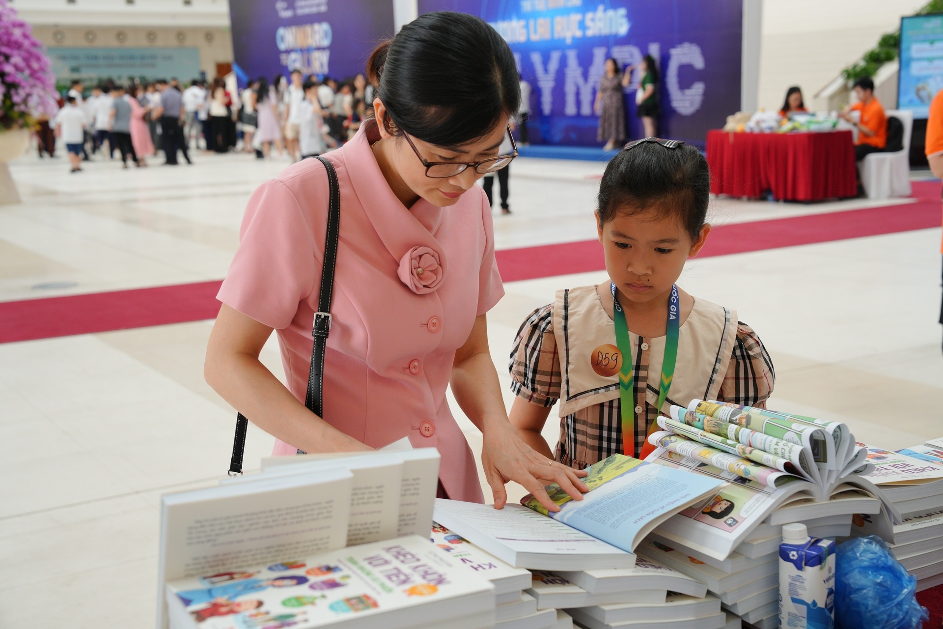 Tại khu vực trưng bày, nhiều em nhỏ thích thú đọc truyện tranh, tham gia các trò chơi tương tác vui nhộn, trong khi phụ huynh cũng dành thời gian tìm hiểu về nội dung giáo dục tài chính dành cho con trẻ.
