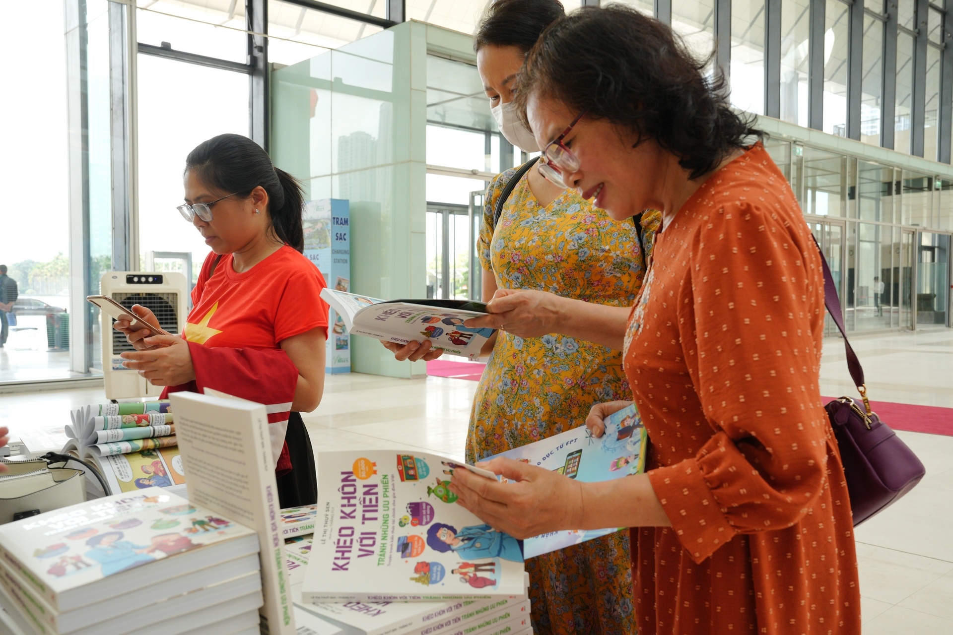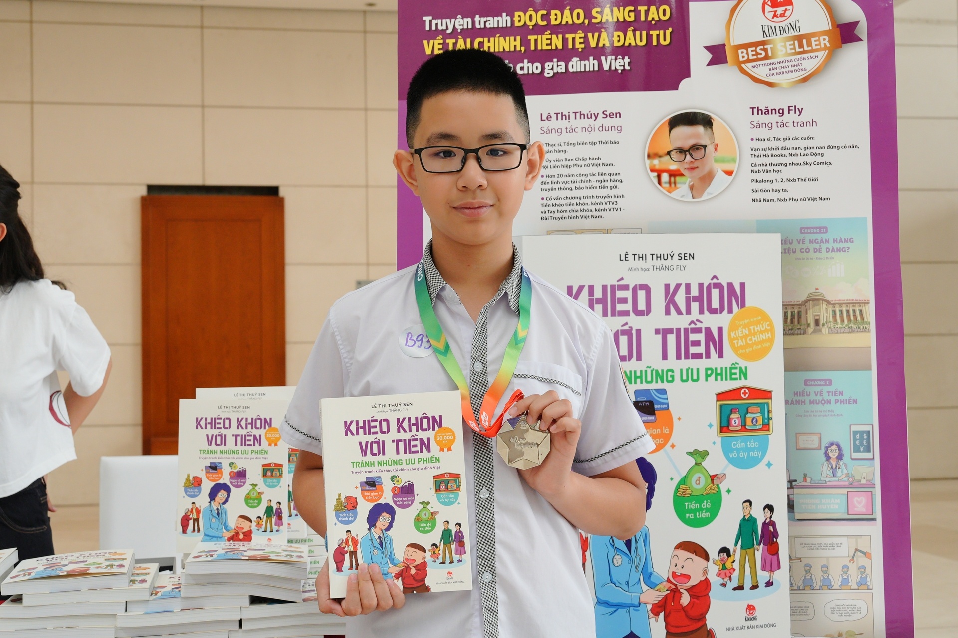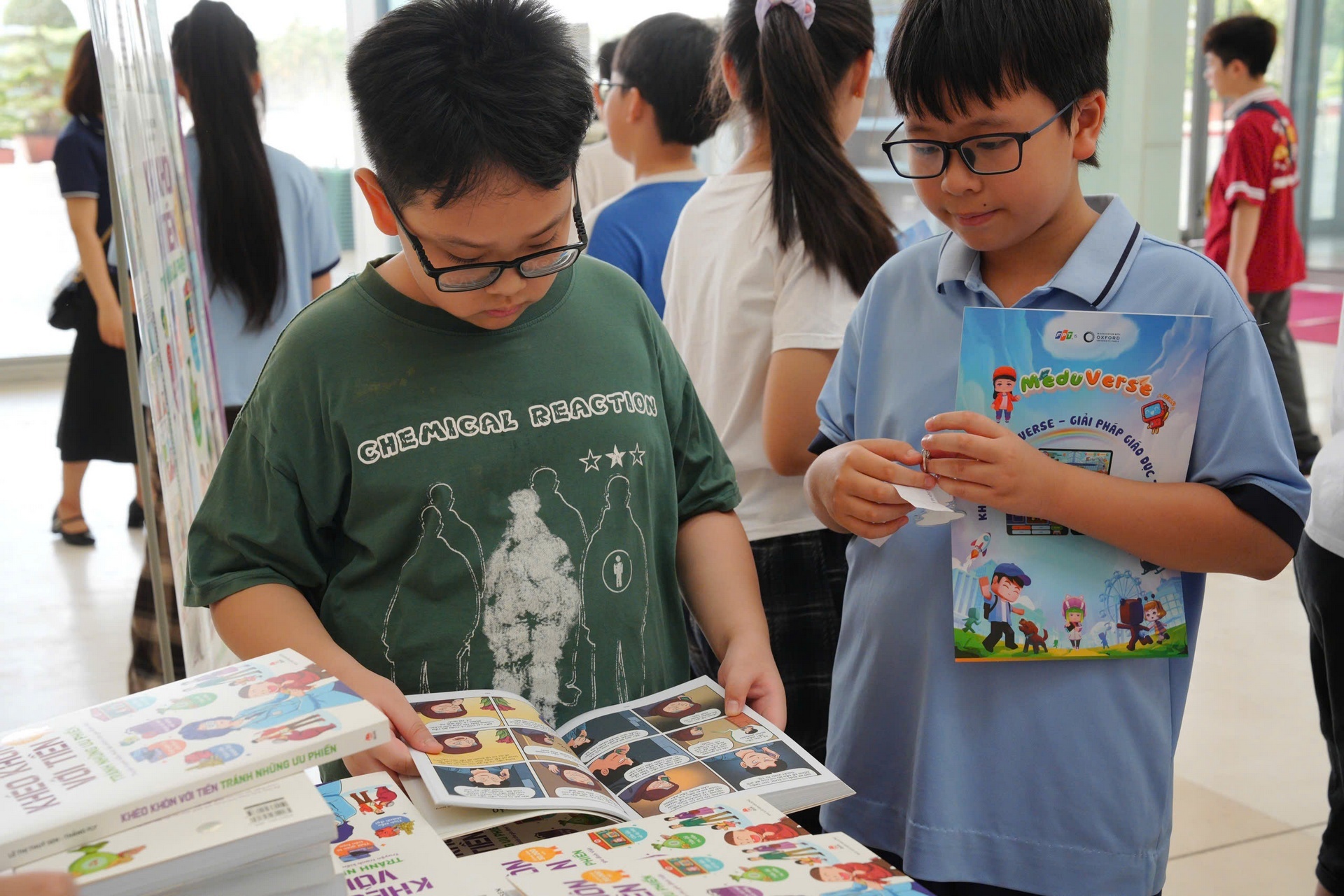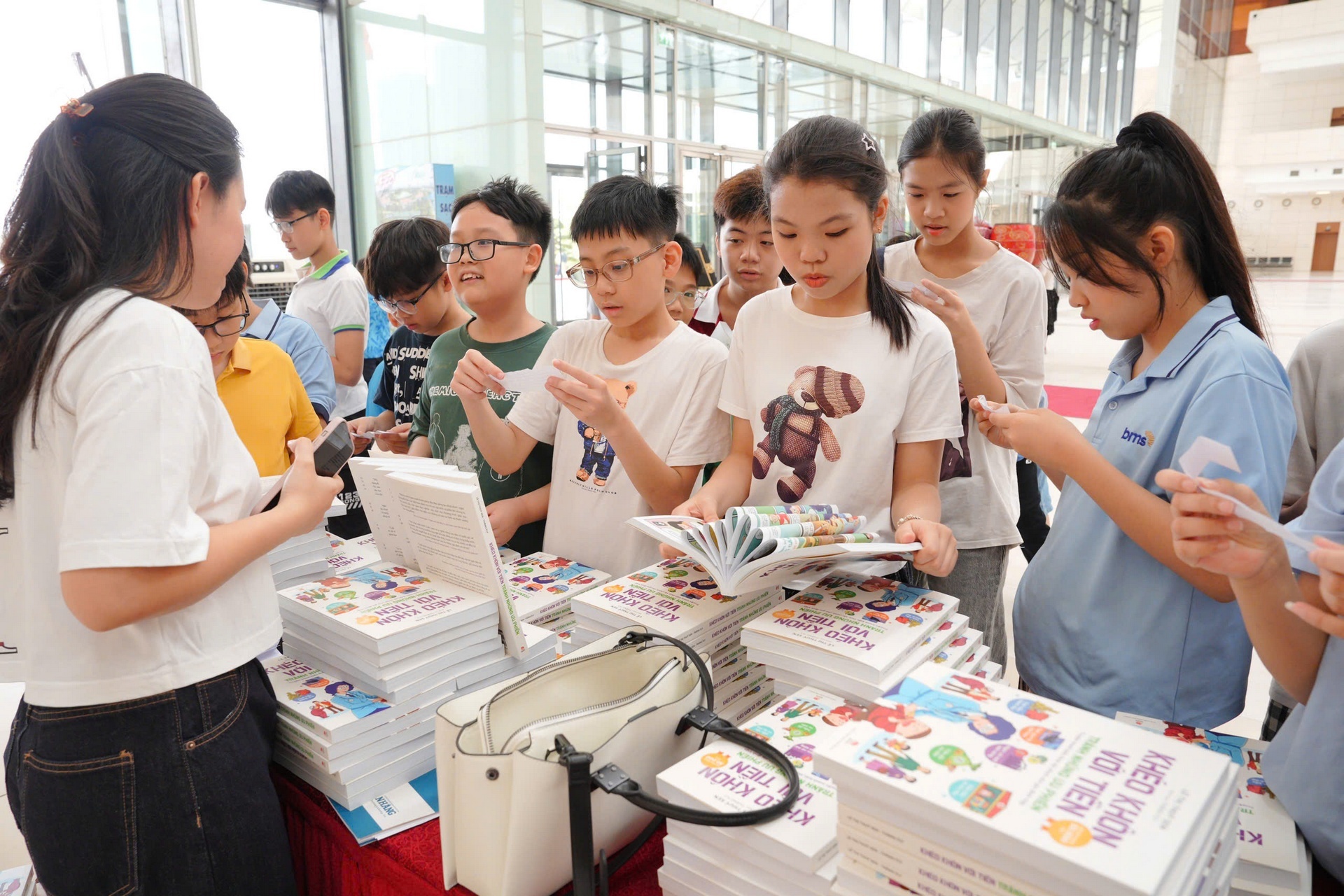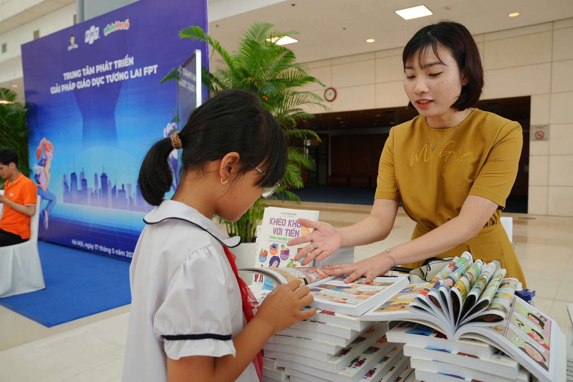 Tại khu vực trưng bày, nhiều em nhỏ thích thú đọc truyện tranh, tham gia các trò chơi tương tác vui nhộn, trong khi phụ huynh cũng dành thời gian tìm hiểu về nội dung giáo dục tài chính dành cho con trẻ.