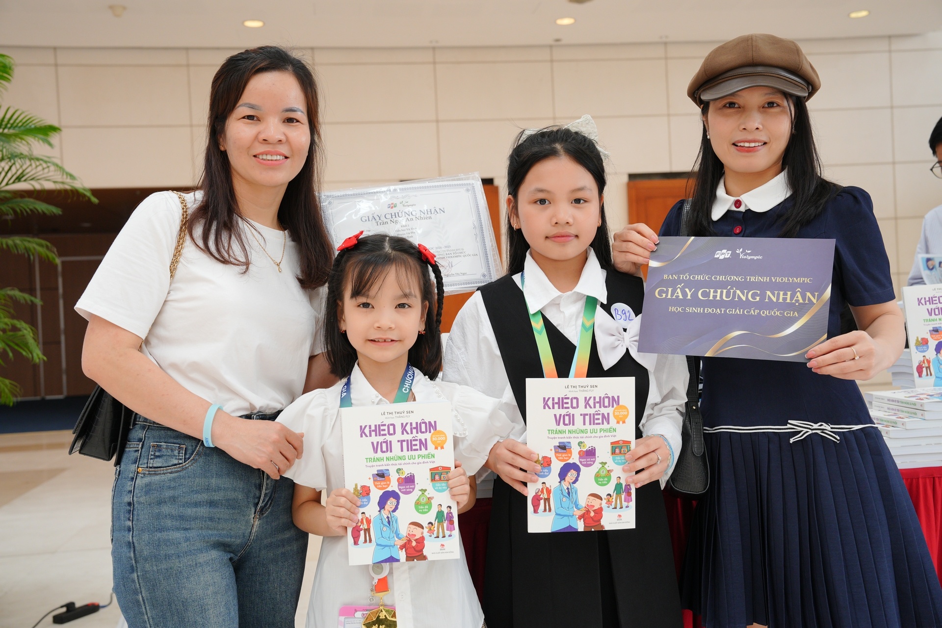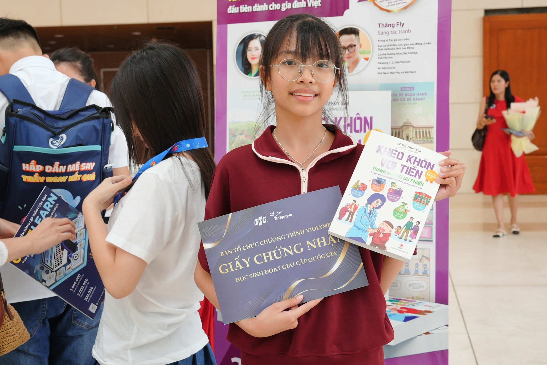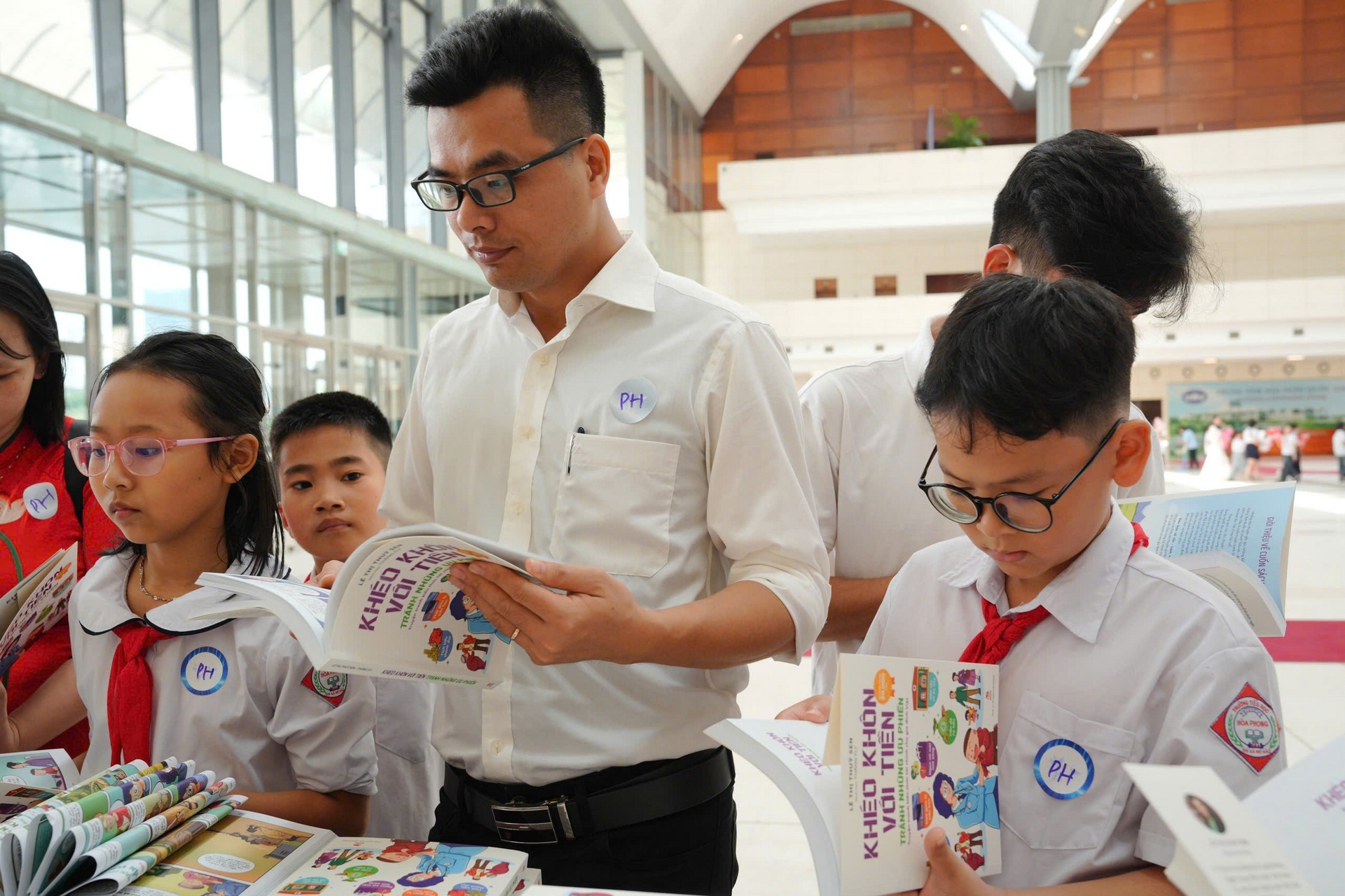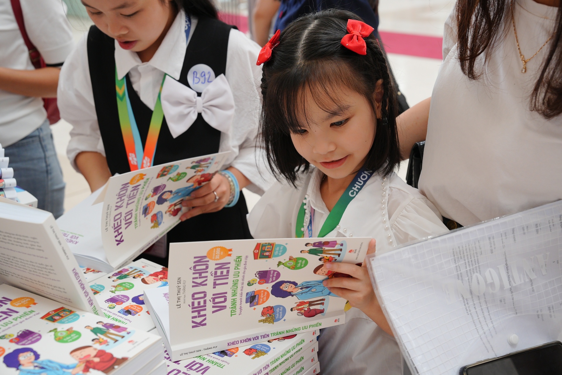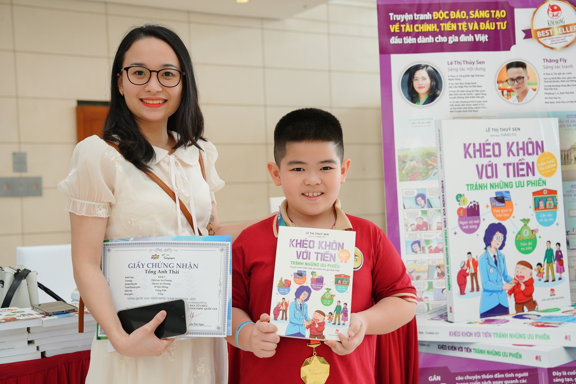 Tại khu vực trưng bày, nhiều em nhỏ thích thú đọc truyện tranh, tham gia các trò chơi tương tác vui nhộn, trong khi phụ huynh cũng dành thời gian tìm hiểu về nội dung giáo dục tài chính dành cho con trẻ.