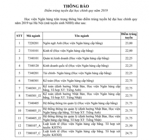Học viện Ngân hàng thông báo điểm trúng tuyển hệ đại học chính quy năm 2019 tại Hà Nội