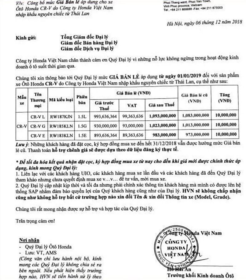 Hiện tại, CR-V vẫn còn hàng giao ngay tại đại lý, tuy nhiên khách hàng muốn mua xe phải mua thêm bộ phụ kiện chênh 50 triệu đồng. Nhu cầu mua Honda CR-V tại Việt Nam hiện rất lớn, nhiều hơn so với các mẫu còn lại của hãng. Đứng trước tình thế này, HVN đã giảm nhập Honda Jazz, HR-V, Civic và tăng cường nhập CR-V về.