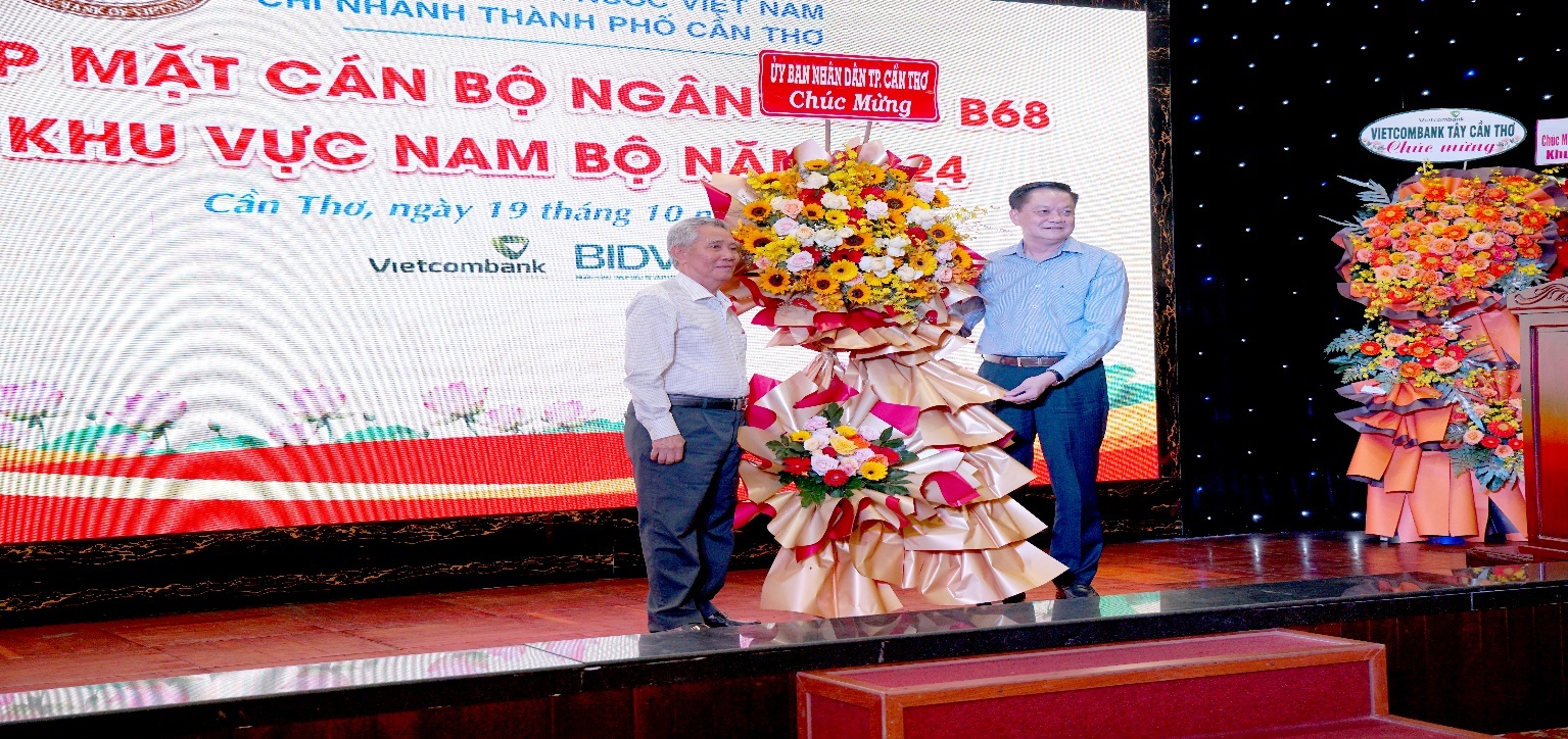| Ông Dương Tấn Hiển – Phó Chủ tịch UBND TP Cần Thơ trao hoa cho Ban liên lạc Cán bộ ngân hàng B68 |