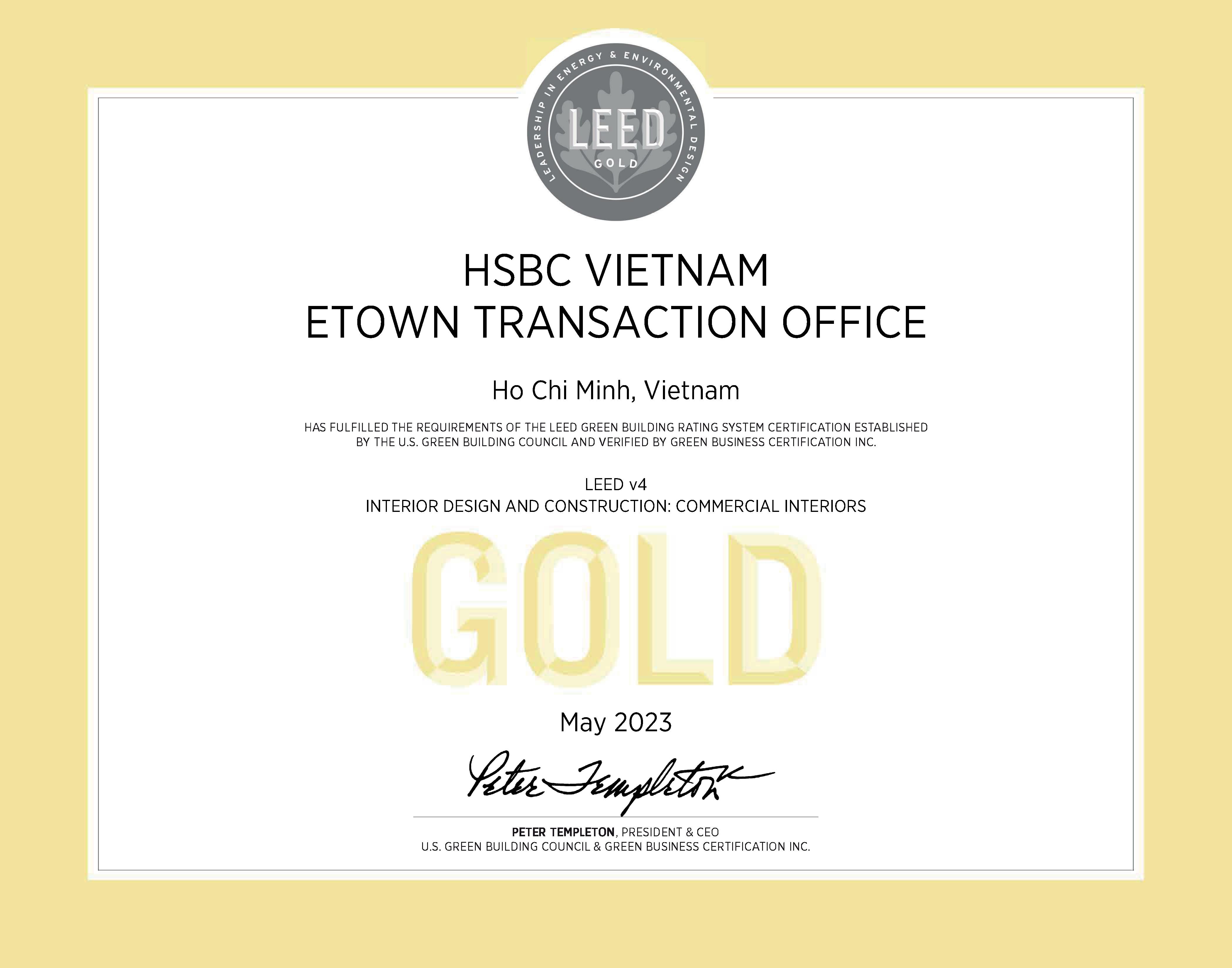 Phòng Giao dịch E-Town của HSBC vừa được trao chứng nhận LEED Vàng, và trở thành chi nhánh ngân hàng đầu tiên tại Việt Nam đạt được chứng nhận LEED.
