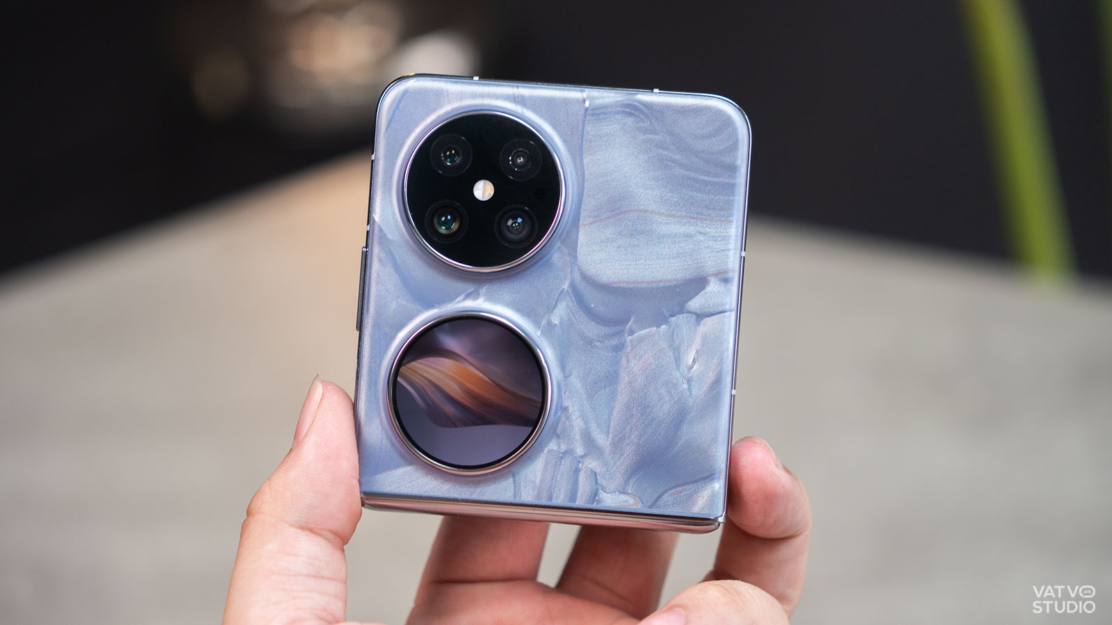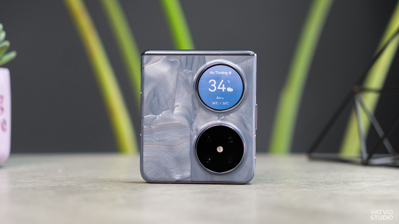 Ấn tượng đầu tiên trên HUAWEI Pocket 2 đến từ ngoại hình. Mặt lưng máy nổi bật với thiết kế vân đá màu xanh, rất đẹp và bắt mắt. Ở nửa phía mặt trên, sản phẩm sở hữu hai “vòng đôi”, bao gồm cụm bốn camera sau và một màn hình nhỏ hiển thị nhanh thông báo, tin tức mới.