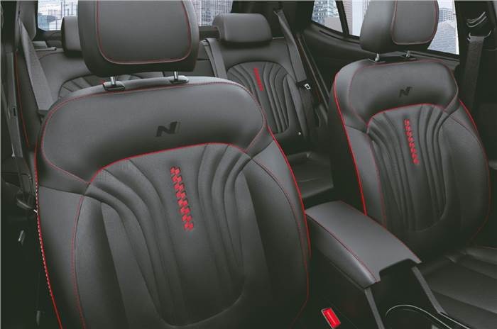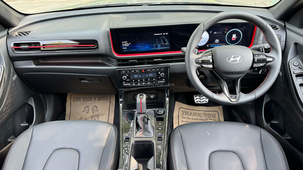 Nội thất giữ nguyên cách thiết kế của Hyundai Creta tiêu chuẩn. Sự khác biệt gồm tông đỏ - đen xuất hiện đan xen, vô lăng và cần số đặc trưng của bản N Line.