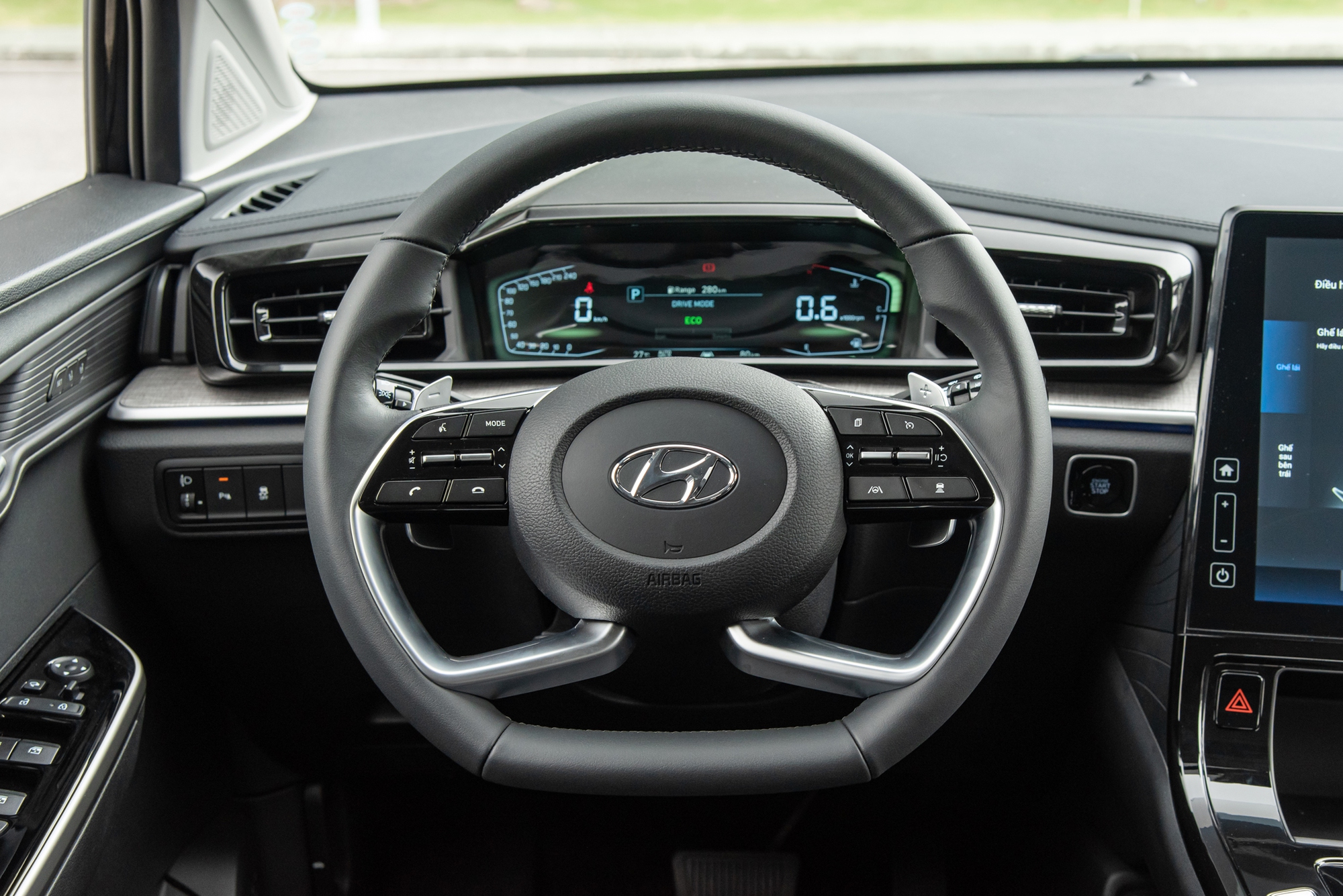Thiết kế khoang cabin của Custin khác biệt các mẫu Hyundai khác khi sử dụng màn hình dọc 10,4 inch, hỗ trợ Apple CarPlay/Android Auto. Vô-lăng quen thuộc tương tự Tucson, tích hợp lẫy số. Phía sau là màn hình LCD hiển thị thông tin như Accent. Nút bấm chuyển số quen thuộc với ai đang sử dụng Santa Fe. Một số trang bị đáng chú ý khác còn có phanh đỗ điện tử, điều hoà tự động, đề nổ từ xa, đèn viền nội thất và 2 cửa sổ trời.