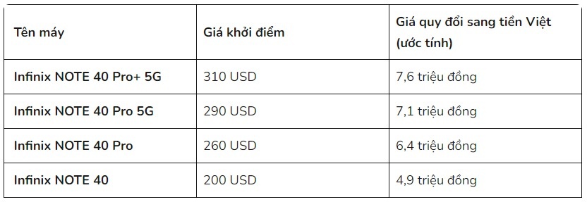 | Giá bán các mẫu máy Infinix NOTE 40 series |
