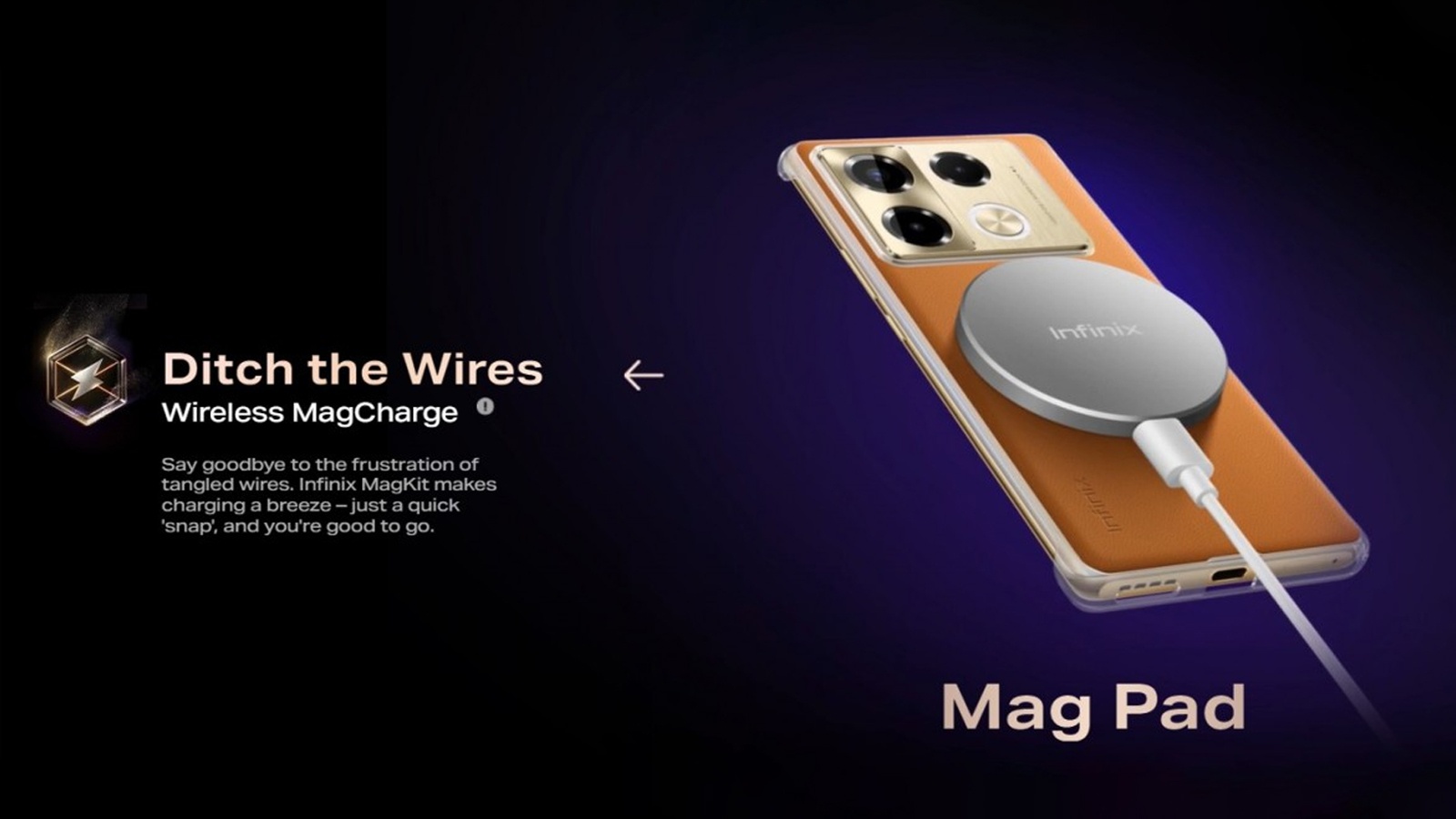 Ngoài ra, Infinix NOTE 40 Pro+ 5G còn có sạc không dây từ tính có công suất 20W. Theo GSMArena, Infinix gọi công nghệ sạc không dây từ tính mới của họ là “MagKit”. Máy cũng hỗ trợ sạc ngược có dây và sạc ngược không dây. Cuối cùng, Infinix NOTE 40 Pro+ 5G đạt chuẩn kháng nước, kháng bụi IP53. Người dùng có thể lựa chọn hai phiên bản màu sắc là Obsidian Black (màu cấu đá cẩm thạch màu đen) và Vintage Green (có mặt lưng giả da màu xanh lá cây).