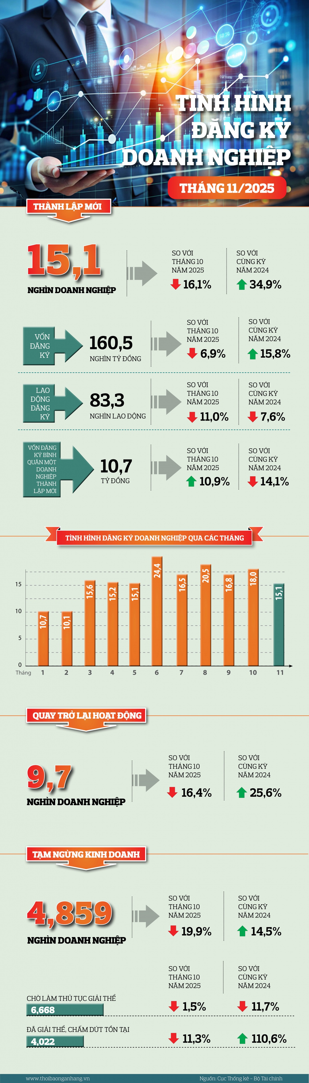 Trong tháng 11/2025, cả nước ghi nhận 15,1 nghìn doanh nghiệp thành lập mới với 160,5 nghìn tỷ đồng vốn đăng ký và 83,3 nghìn lao động, tăng mạnh 34,9% về số doanh nghiệp và 15,8% về vốn so với cùng kỳ năm trước. Cùng với đó, có 9,7 nghìn doanh nghiệp quay trở lại hoạt động, trong khi số doanh nghiệp tạm ngừng, ngừng chờ giải thể và hoàn tất giải thể tiếp tục biến động mạnh.