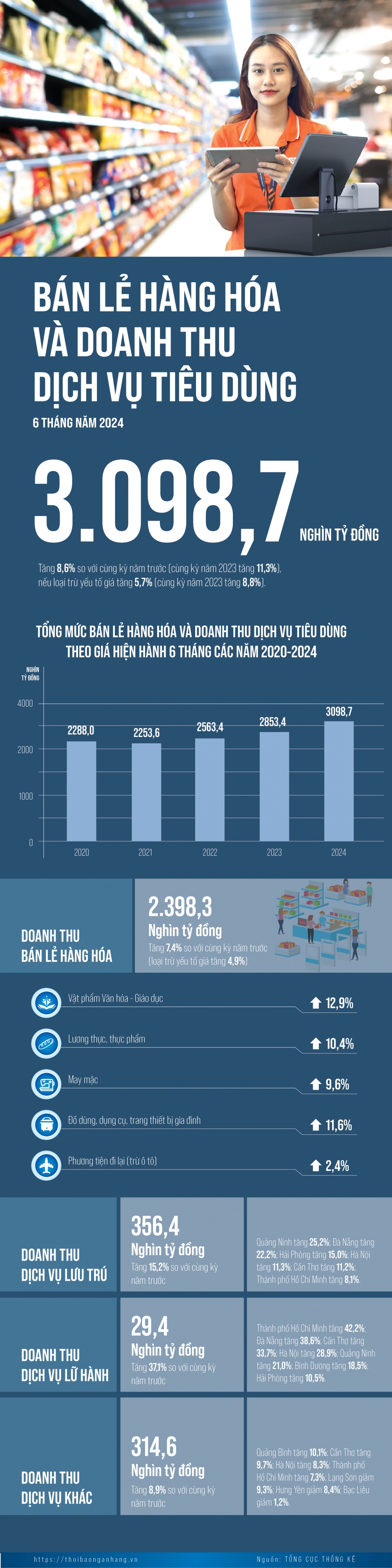Sáu tháng đầu năm 2024, tổng mức bán lẻ hàng hóa và doanh thu dịch vụ tiêu dùng theo giá hiện hành ước đạt 3.098,7 nghìn tỷ đồng, tăng 8,6% so với cùng kỳ năm trước (cùng kỳ năm 2023 tăng 11,3%), nếu loại trừ yếu tố giá tăng 5,7% (cùng kỳ năm 2023 tăng 8,8%).