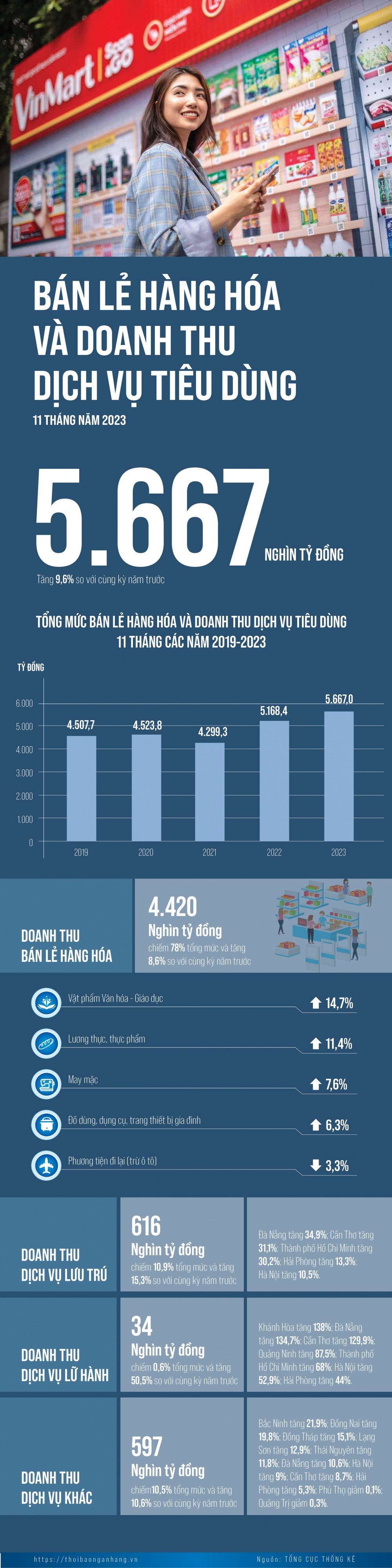 [Infographic] Bán lẻ hàng hóa và doanh thu dịch vụ tiêu dùng 11 tháng năm 2023