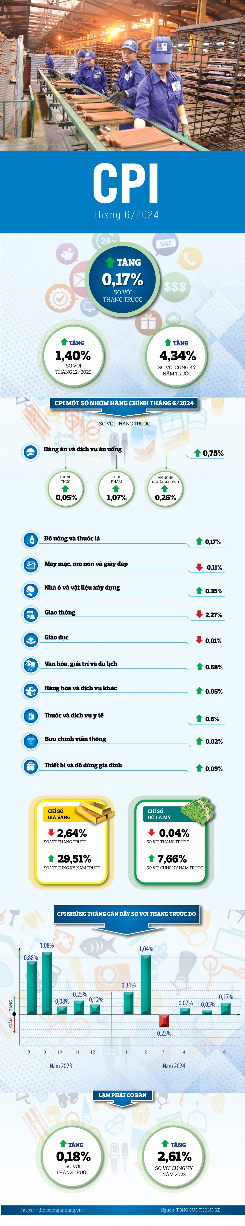 Giá thịt lợn tăng do dịch tả lợn châu Phi tại một số địa phương, giá dịch vụ y tế của một số tỉnh/thành phố được điều chỉnh theo Thông tư số 22/2023/TT-BYT của Bộ Y tế là những nguyên nhân chính làm chỉ số giá tiêu dùng (CPI) tháng 6/2024 tăng 0,17% so với tháng trước. So với tháng 12/2023 CPI tháng Sáu tăng 1,40% và so với cùng kỳ năm trước tăng 4,34%.