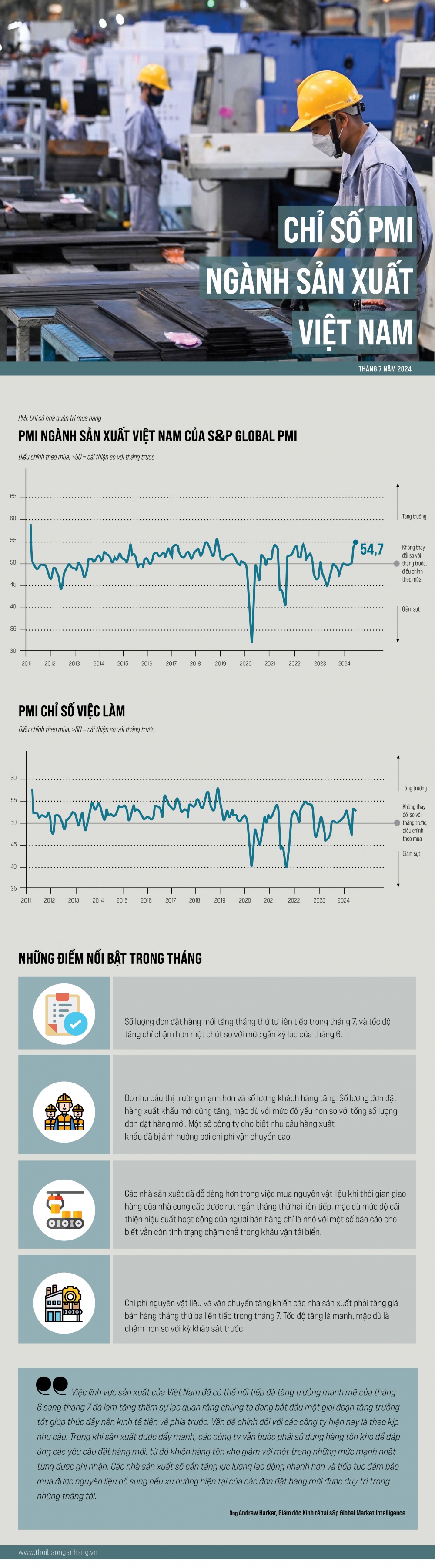 Chỉ số Nhà Quản trị Mua hàng - Manufacturing Purchasing Managers' Index™ (PMI®) ngành sản xuất của Việt Nam không thay đổi khi đạt 54,7 trong tháng 7/2024, cho thấy các điều kiện kinh doanh ngành sản xuất của Việt Nam tiếp tục cải thiện đáng kể. Trên thực tế, lần cuối cùng tăng trưởng được ghi nhận nhanh hơn là vào tháng 11/2018. Sự cải thiện đáng kể được ghi nhận ở tất các lĩnh vực hàng hóa tiêu dùng, hàng hóa trung gian và hàng hóa đầu tư cơ bản.