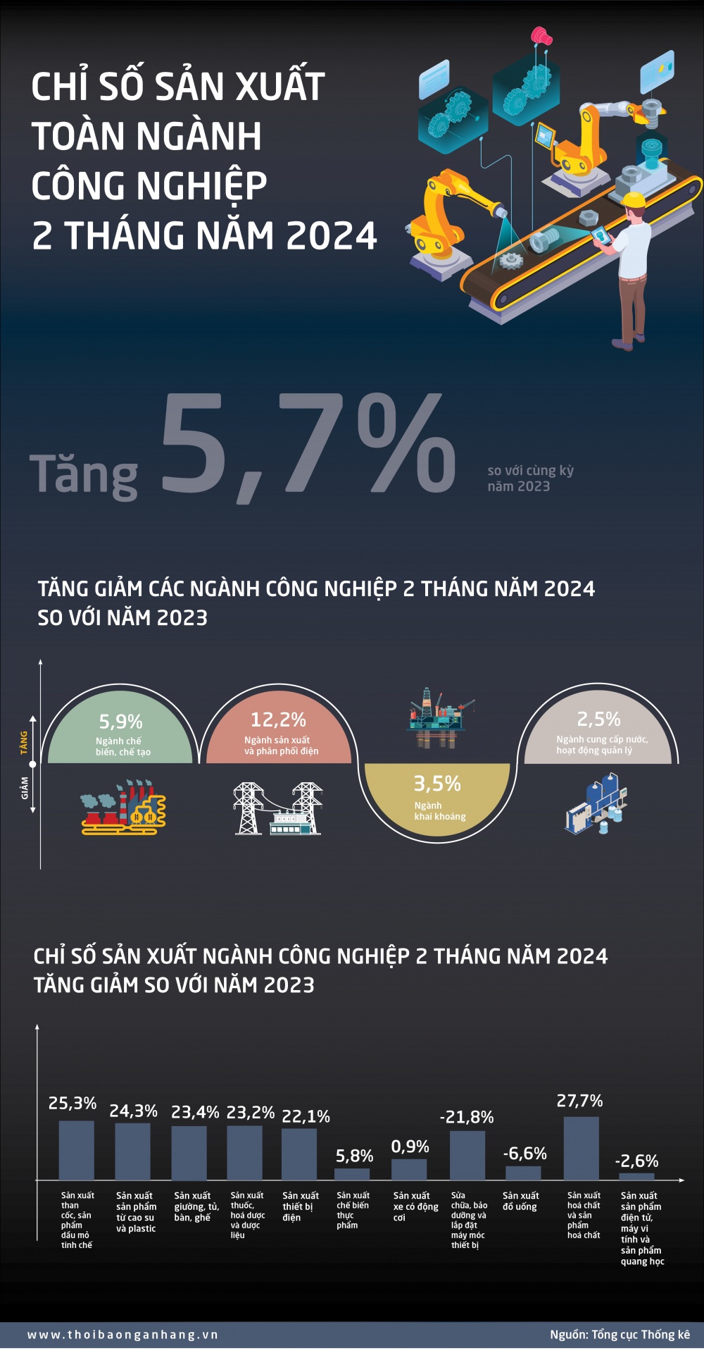 2 tháng đầu năm 2024, chỉ số sản xuất toàn ngành công nghiệp tăng 5,7% so với cùng kỳ năm trước. Trong đó, ngành khai khoáng giảm 15,3% so với cùng kỳ năm trước; ngành chế biến, chế tạo giảm 6,5%; sản xuất và phân phối điện giảm 3,6%; cung cấp nước, hoạt động quản lý và xử lý rác thải, nước thải giảm 1,1%.