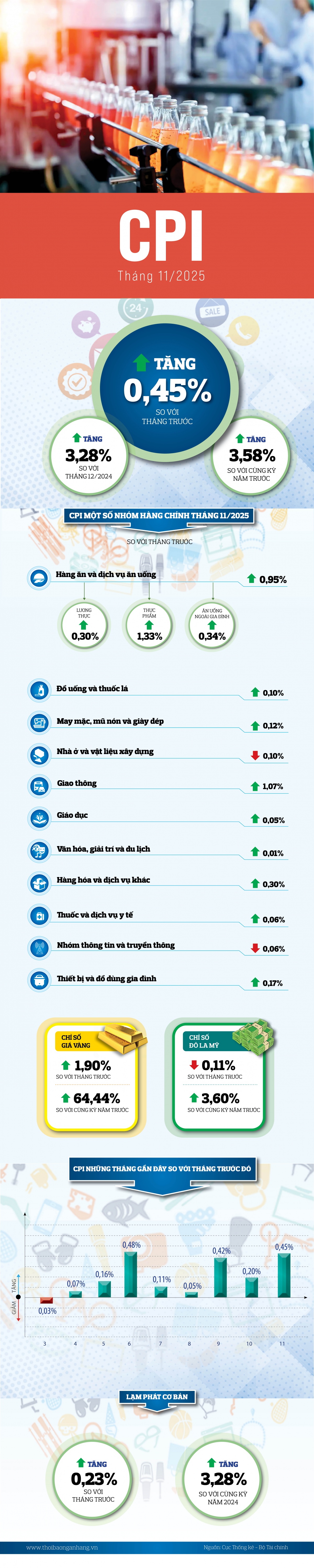 Chỉ số giá tiêu dùng (CPI) tháng 11 tăng 0,45% so với tháng trước, chủ yếu do giá thực phẩm và dịch vụ ăn uống ngoài gia đình tăng tại các địa phương chịu ảnh hưởng mưa lũ, cùng với chi phí đầu vào và giá nhiên liệu đi lên. So với tháng 12/2024, CPI tháng 11 tăng 3,28% và tăng 3,58% so với cùng kỳ. Bình quân 11 tháng năm 2025, CPI tăng 3,29%, trong khi lạm phát cơ bản giữ ở mức 3,21%.