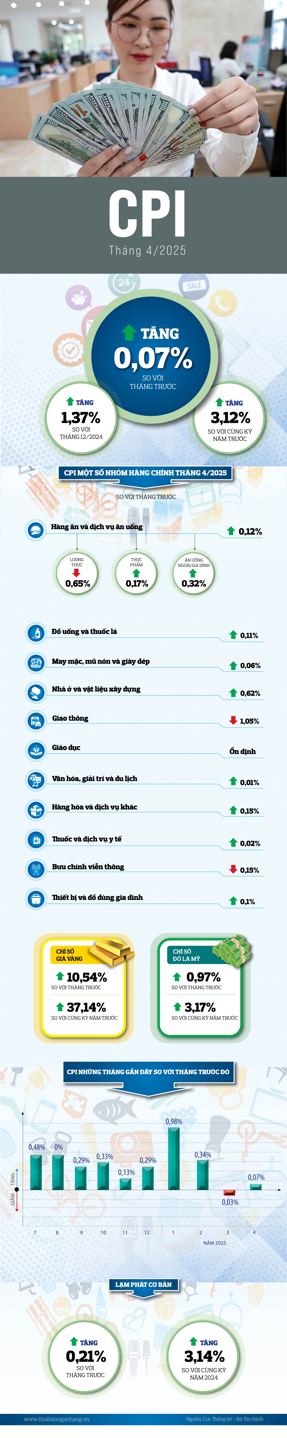 Chỉ số giá tiêu dùng (CPI) tháng 4/2025 tăng nhẹ 0,07% so với tháng trước, chủ yếu do giá thuê nhà, thực phẩm và ăn uống ngoài gia đình tăng. So với cùng kỳ năm 2024, CPI tăng 3,12%; tính chung bốn tháng đầu năm, CPI tăng 3,2% và lạm phát cơ bản tăng 3,05%.