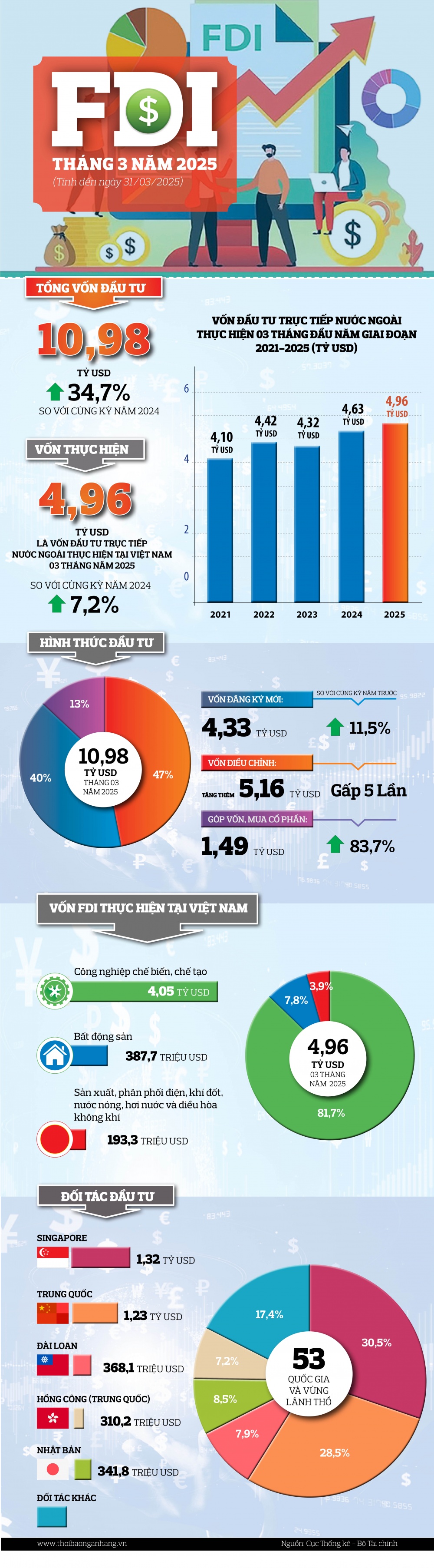 Tính đến ngày 31/3/2025, tổng vốn đầu tư nước ngoài đăng ký vào Việt Nam đạt 10,98 tỷ USD, tăng 34,7% so với cùng kỳ năm trước. Trong đó, vốn đăng ký điều chỉnh đạt 5,16 tỷ USD, gấp 5 lần; vốn góp, mua cổ phần đạt 1,49 tỷ USD, tăng 83,7%. Vốn thực hiện ước đạt 4,96 tỷ USD, tăng 7,2% và là mức cao nhất trong 5 năm qua. Ngành công nghiệp chế biến, chế tạo tiếp tục giữ vai trò chủ lực, thu hút hơn 6,3 tỷ USD vốn đăng ký và 4,05 tỷ USD vốn thực hiện, chiếm lần lượt 66,5% và 81,7% tổng số.