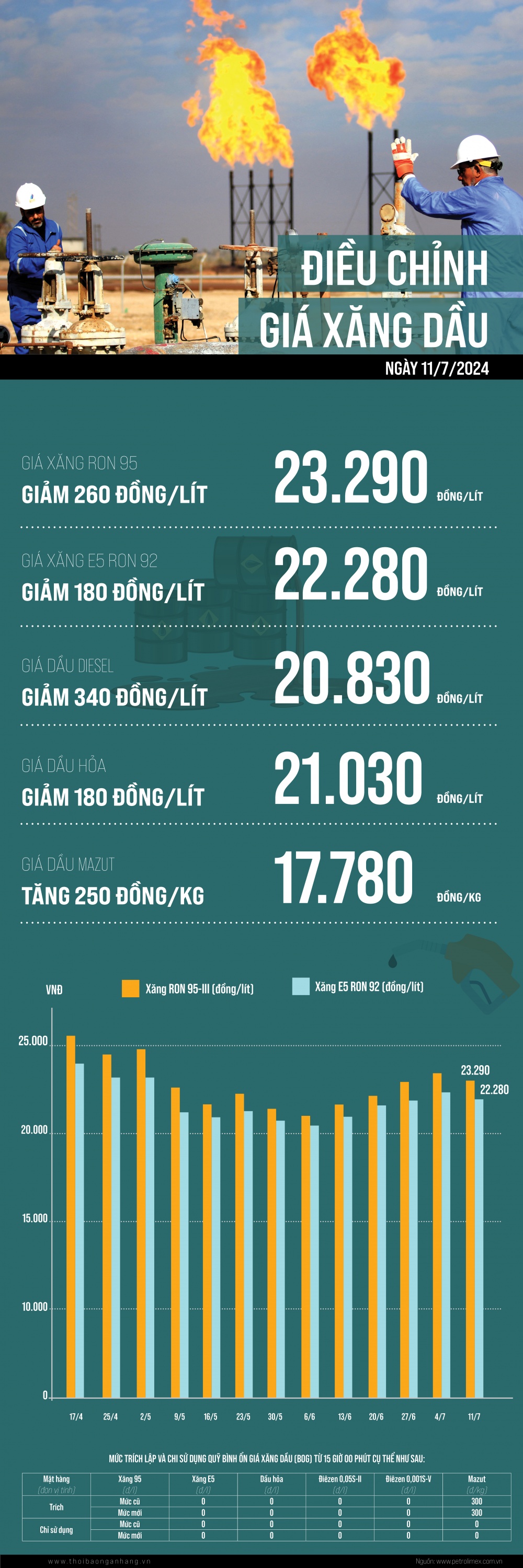 [Infographic] Giá xăng, dầu cùng giảm trong kỳ điều hành 11/7/2024