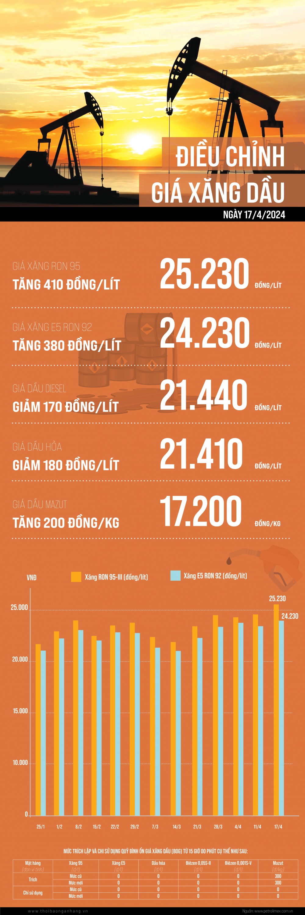 Từ 15h ngày 17/4, giá xăng E5 RON 92 được điều chỉnh tăng 380 đồng, còn xăng RON 95 tăng 410 đồng/lít. Từ ngày 4/1 đến nay, giá xăng, dầu cùng có 10 lần tăng, 6 lần giảm. Đây cũng là lần đầu giá xăng RON 95 vượt 25.000 đồng một lít kể từ tháng 10 năm ngoái.