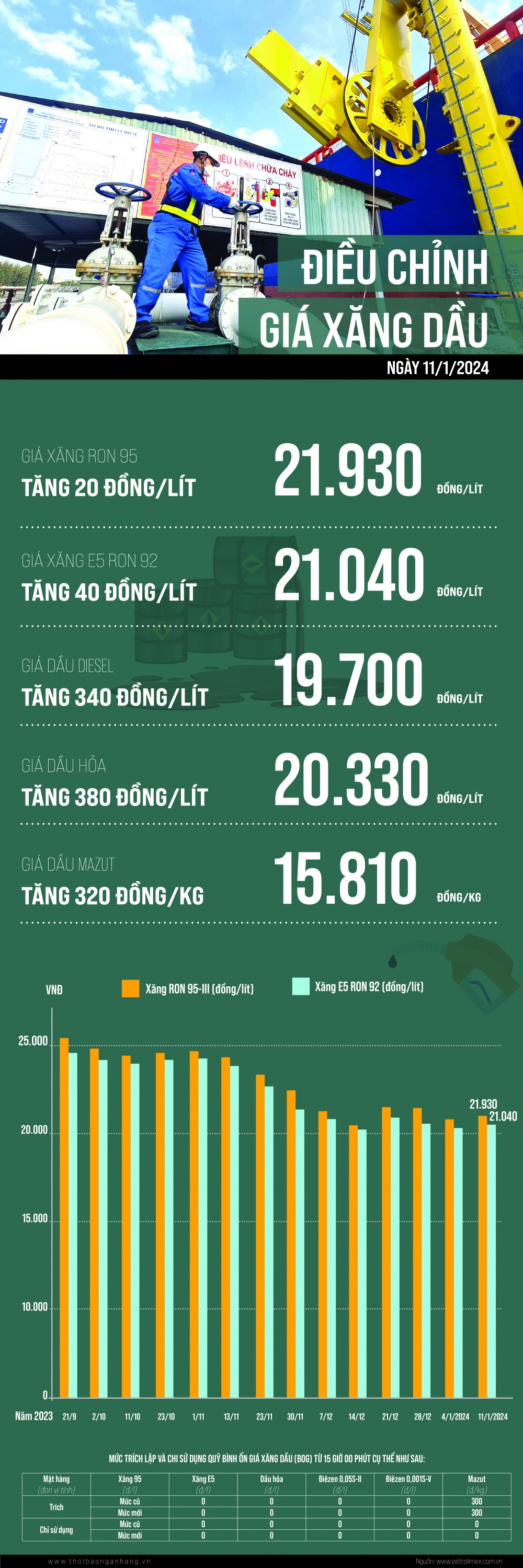 [Infographic] Giá xăng dầu tăng nhẹ trong kỳ điều hành 11/1/2024