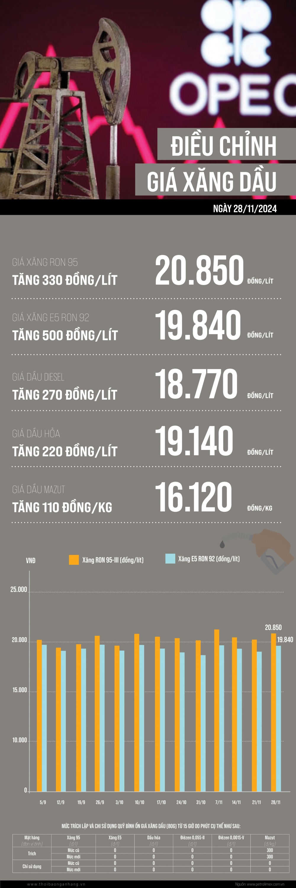 [Infographic] Giá xăng, dầu tăng trong kỳ điều hành 28/11