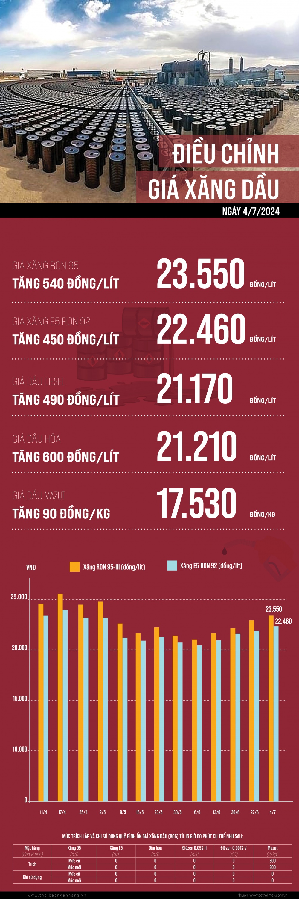 [Infographic] Giá xăng, dầu tăng trong kỳ điều hành 4/7/2024