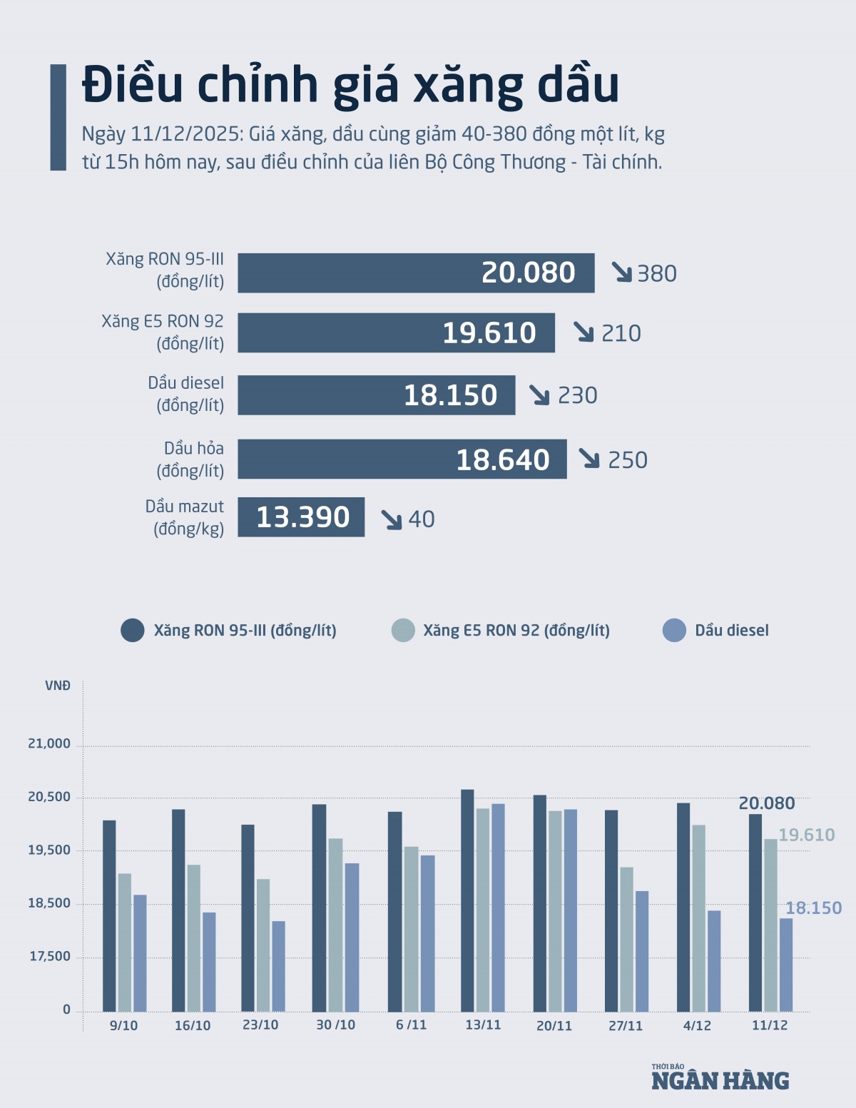 [Infographic] Giá xăng dầu tiếp tục giảm, RON 95 còn 20.080 đồng/lít